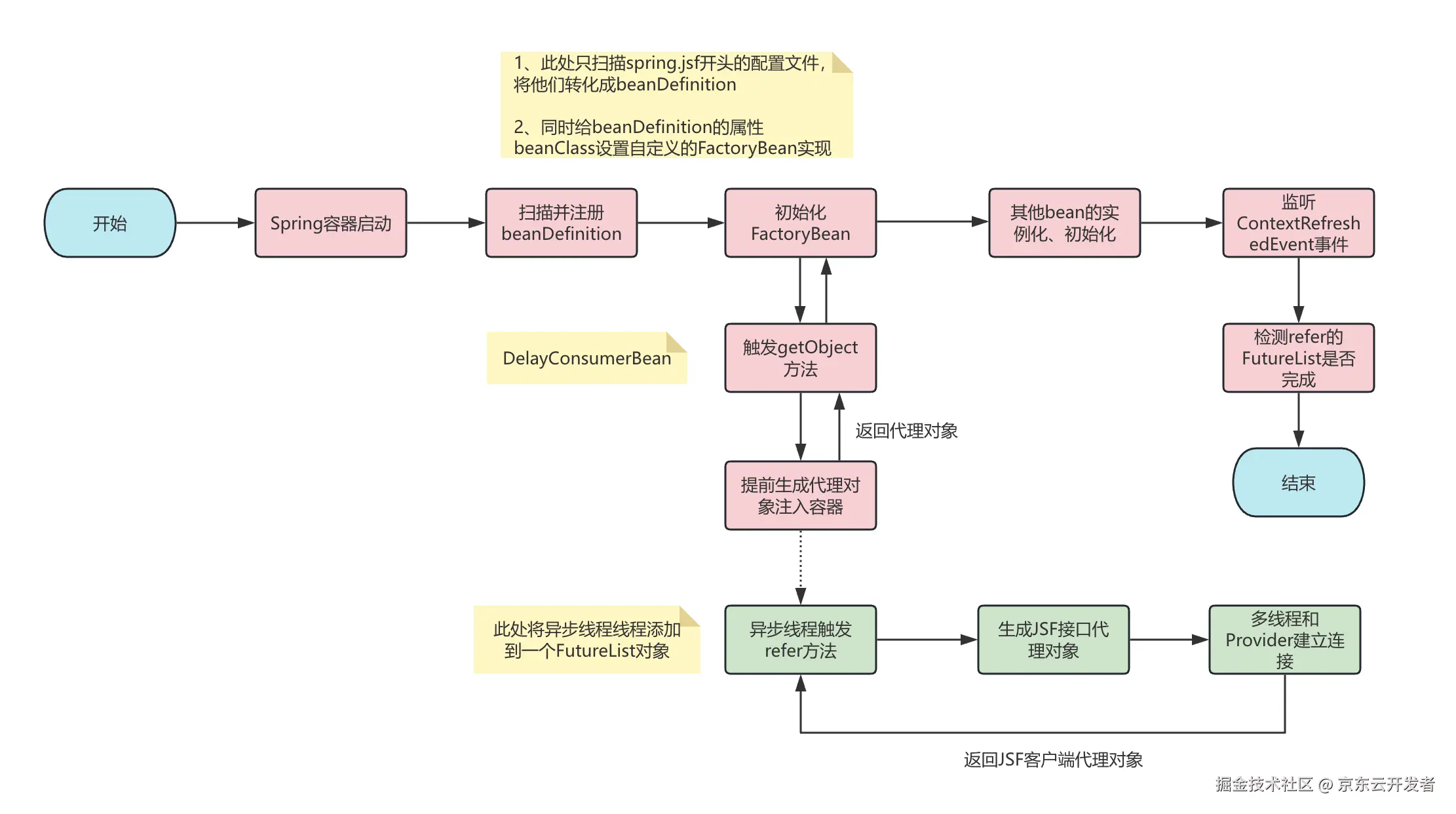 3、Jsf Consumer客户端代理bean异步生成,此处主要核心在于使用一个自定义代理对象提前返回引用,这种思想我们也可以应用到其他需要异步初始化对象的地方去,具体可以参考3.2节的流程图。
