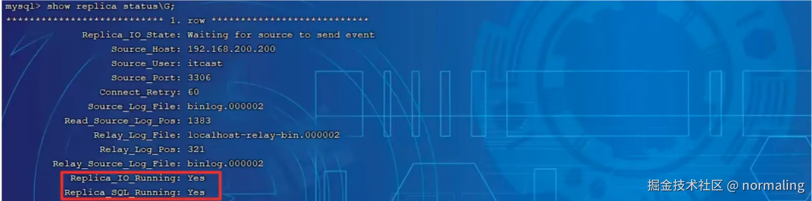 show replica status; #8.0.22之后 show slave status; #8.0.22之前只要如下是yes代表成功