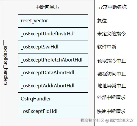 以ARMv7-a架构为例,中断和异常处理的入口为中断向量表,中断向量表包含各个中断和异常处理的入口函数。