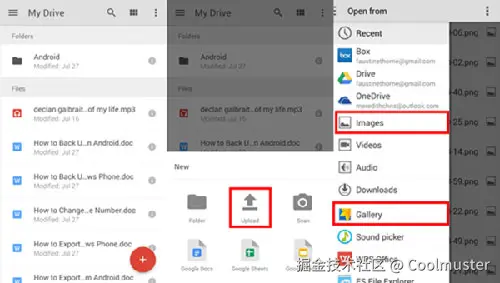 在Android手机上打开 Google 云端硬盘,然后使用您的帐户和密码登录。然后,点击加号图标并选择“上传”选项。您可以在弹出的对话框中选择从图像或图库中打开文件。之后,勾选您想要传输到 Google 云端硬盘的照片。
