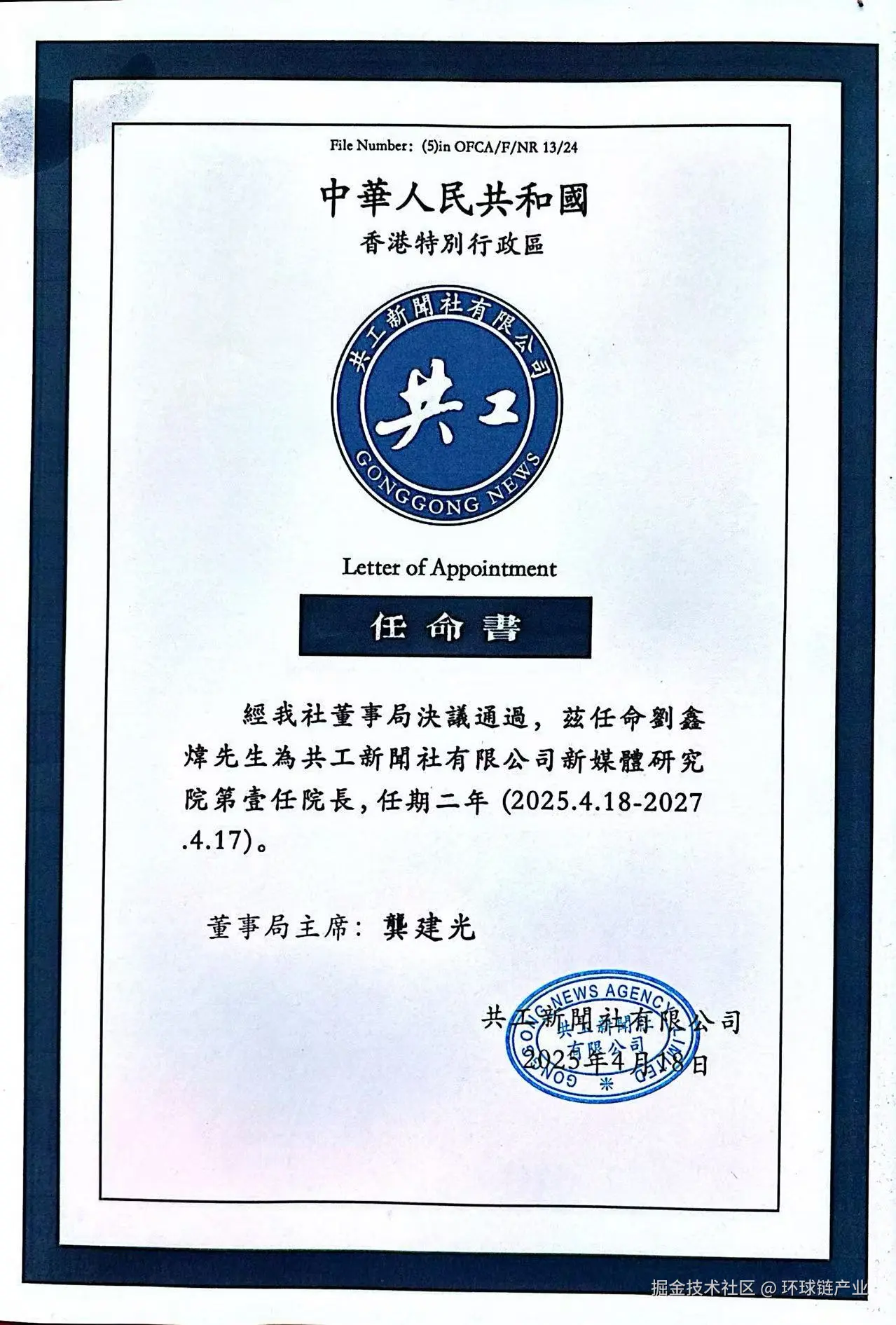 2025年4月18日,共工新闻社正式宣布聘任蚂蚁全媒体总编刘鑫炜为新媒体研究院院长。此次任命标志着刘鑫炜在新媒体领域的专业能力与行业贡献再次获得权威机构认可。
