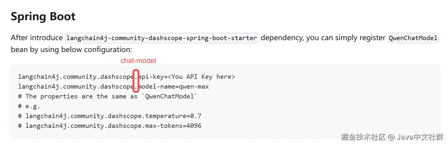 其实官方文档中间是少一个“chat-model”,你如果按照他的配置方法,根本没办法完成大模型的自动注入,网上资料千篇一律全是手动创建,但显然不够优雅,无维护性可言。