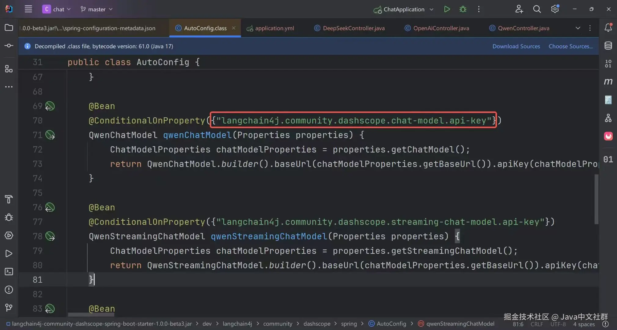 最后看了源码才发现,如果想自动装配,需要配置一个“chat-model”,源码如下: