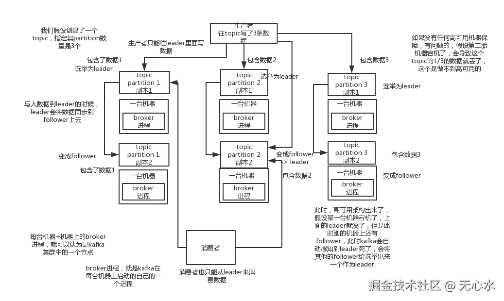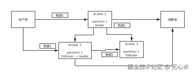 - 一个partition可以有多个副本,最少两个。replicat分leader,follower。