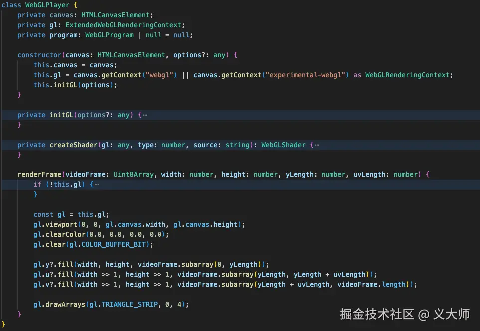webglPlay是我们写的一个用于WebGL渲染的类,下文我们会来讨论他,通过这个函数,我们对YUV各个分量的长度做出了计算,然后初始化了WebGL这个类,这个类接受一个canvas的dom元素,因为WebGL在网页中渲染依赖于canvas作为宿主容器。然后将其中的变量来作为入参传入给webglPlayer的函数renderFrame方法。