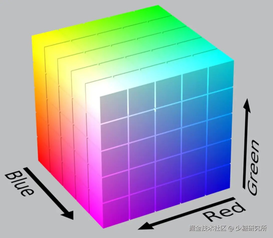如果将RGB看作是三维空间中的三个坐标,可以得到下面这样一张色彩空间图:
