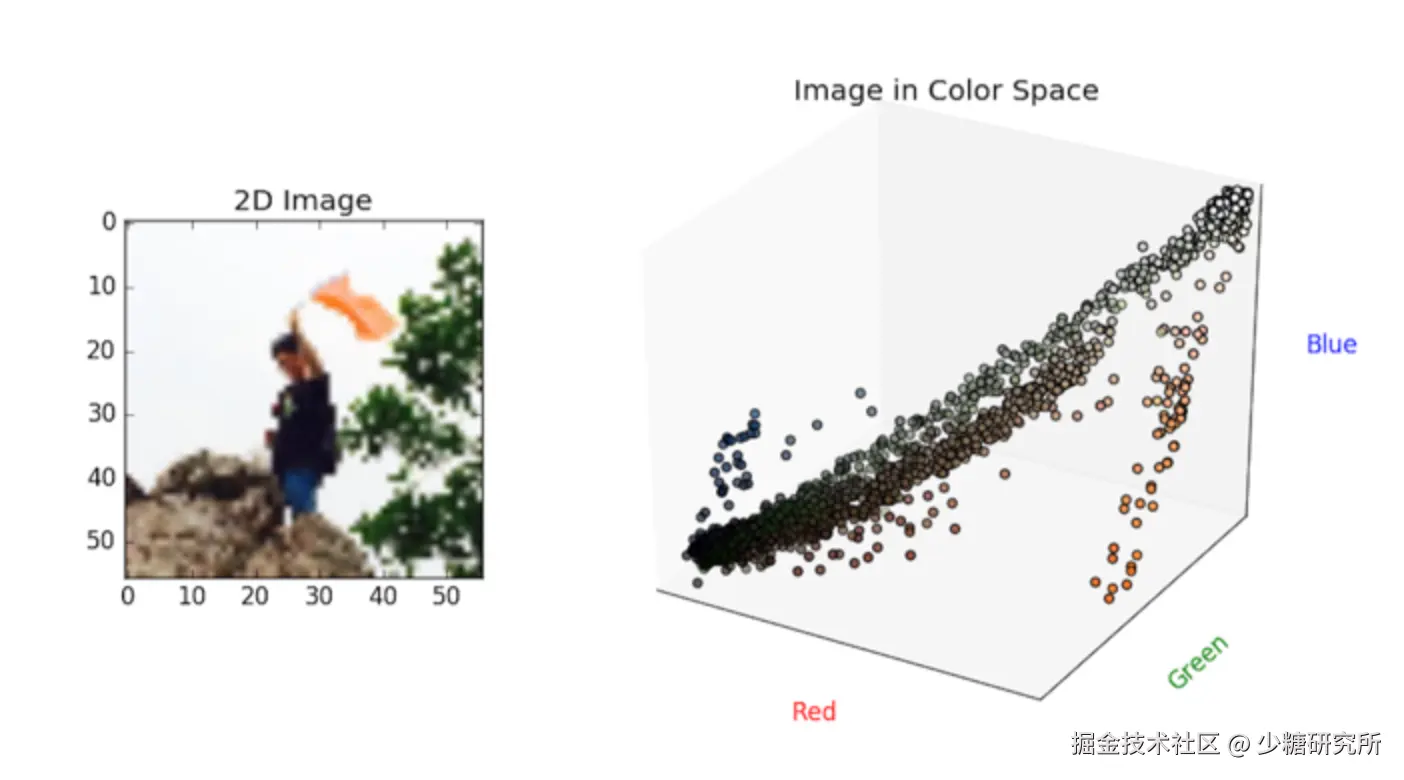 图像的每个像素可以表示为一个 RGB 值,比如 (128, 200, 90)。那么一个图像就可以看作是一个 RGB 色彩空间中的很多点。