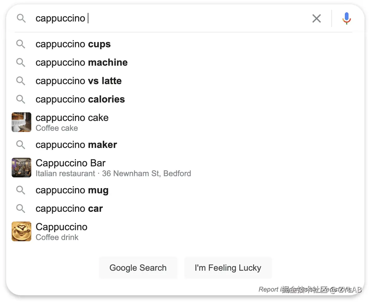 - Google 搜索框建议 (Google Suggest): 在 Google 搜索时自动弹出的建议。