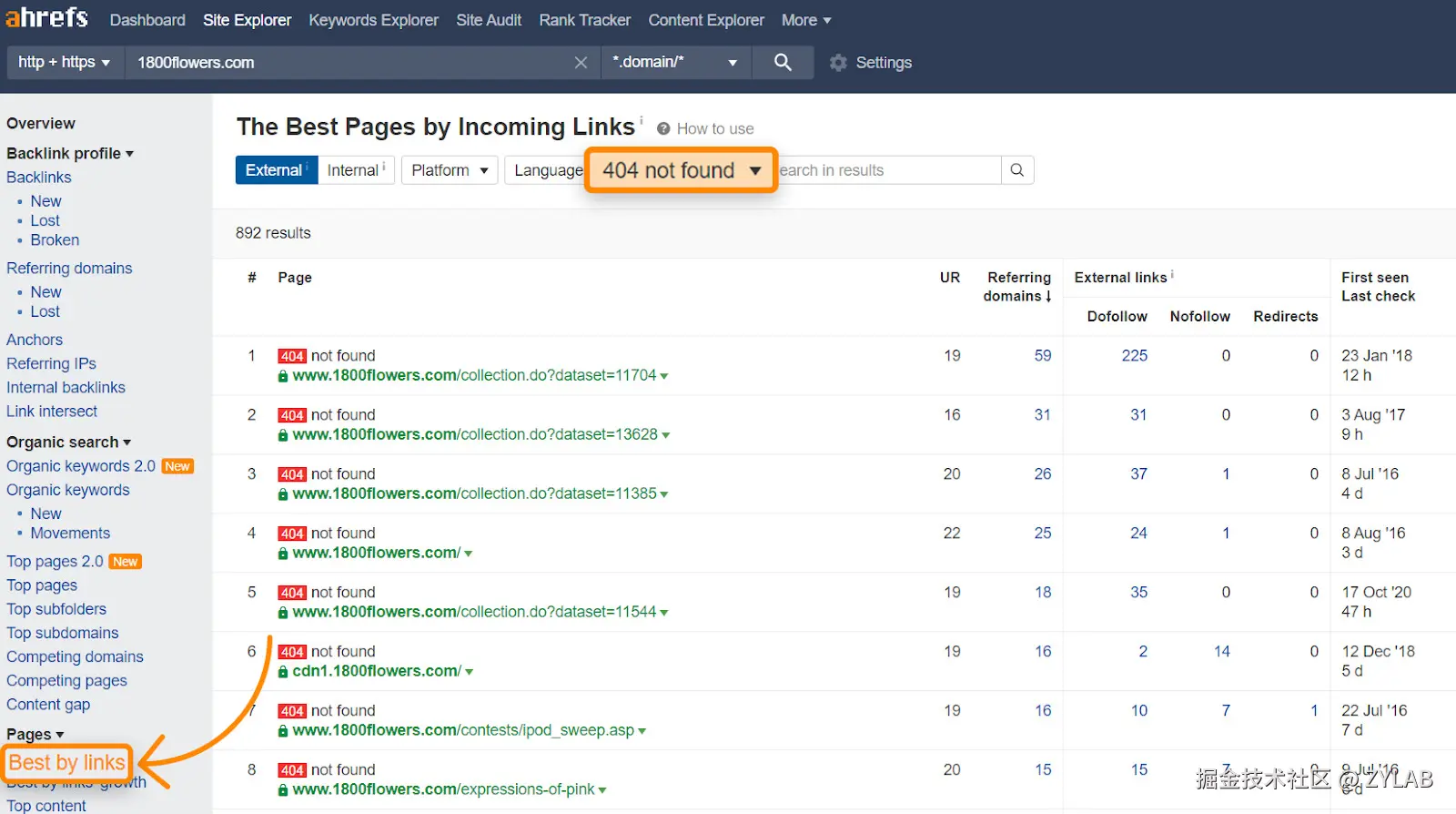 - 查看报告列表。如果发现有 404 页面后面跟着较高的 "Referring domains" (引用域,表示有多少个网站链接到这个页面) 数量,说明这个失效页面曾经很重要。