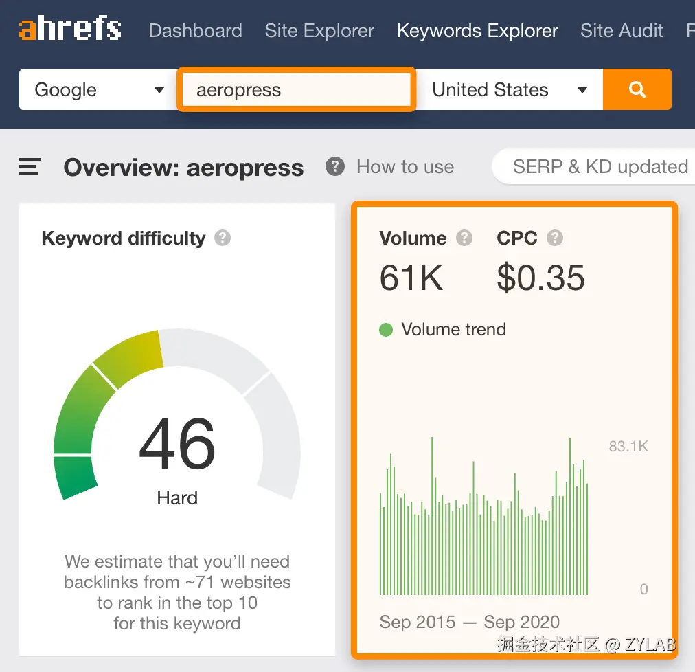 - KD(关键词难度,在关键词研究工具里可以看到)越低越好,越低说明竞争越小,越容易排名。