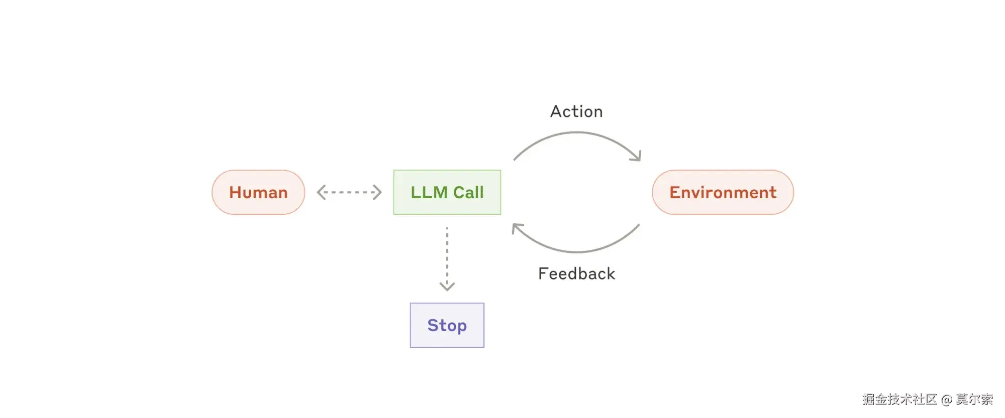 在后文中,Anthropic 将 Agent 定义为"...本质上只是大模型在循环中基于环境反馈使用工具的系统"。
