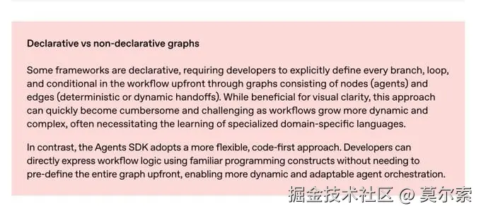 这与声明式或非声明式无关,完全关乎工作流 vsAgent。你可以轻松将 Agents SDK 的 Agent 逻辑表示为声明式图,且该图与 Agents SDK 同样动态灵活。