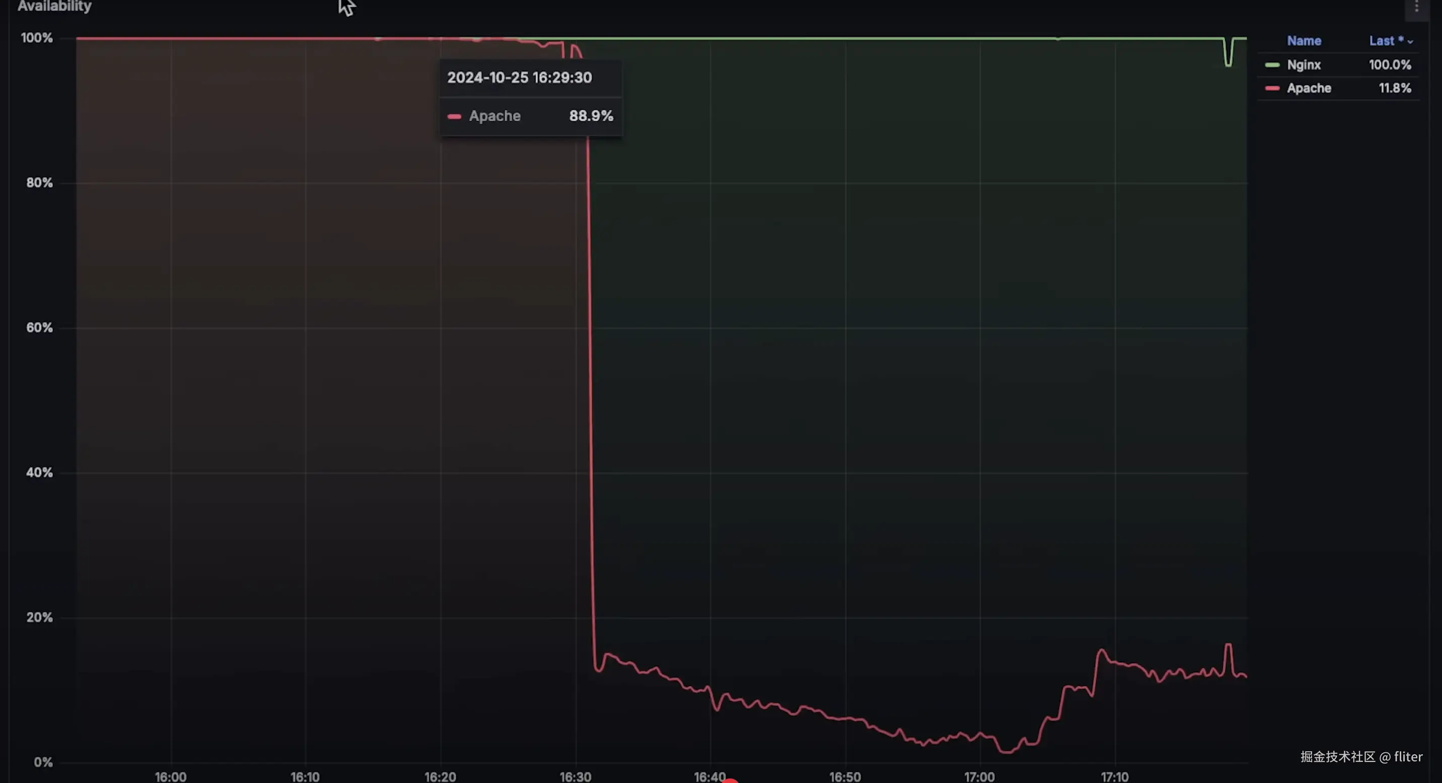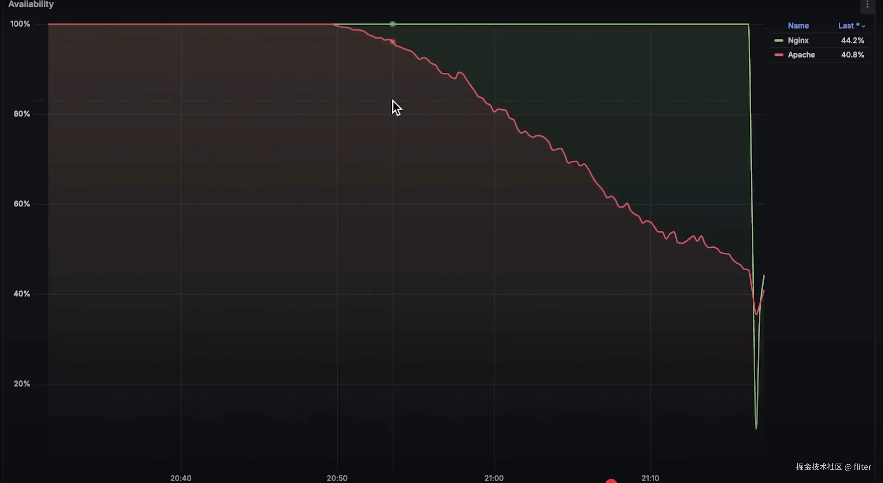 在大约每秒 6,000 个请求时,Apache 的延迟开始增加。这很可能是由于高 CPU 使用率达到了其限制,并且在这个阶段 Apache 的可用性也开始下降。