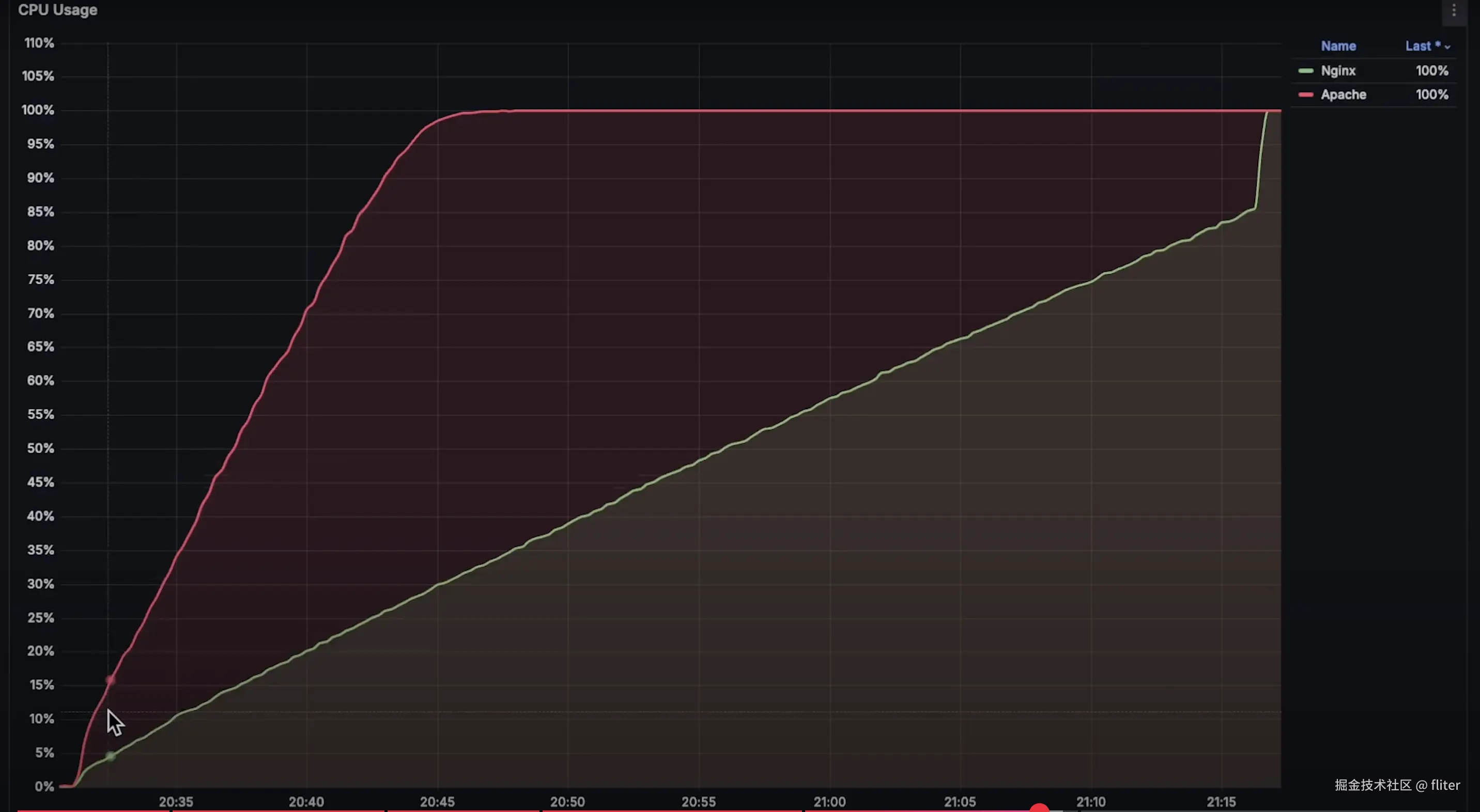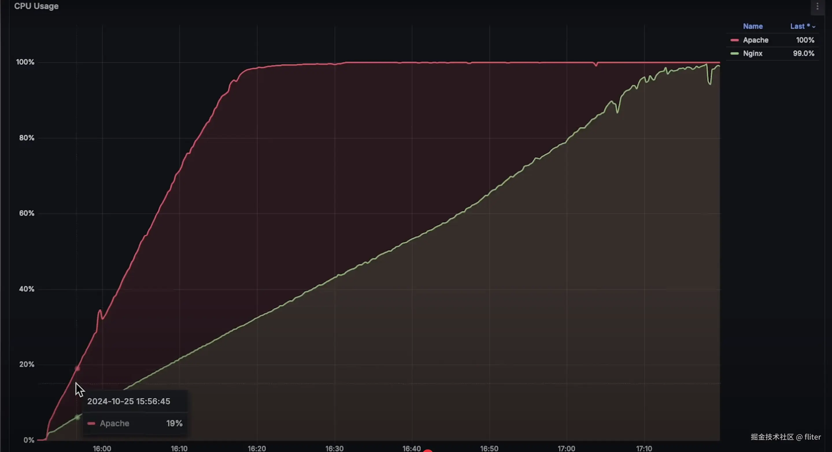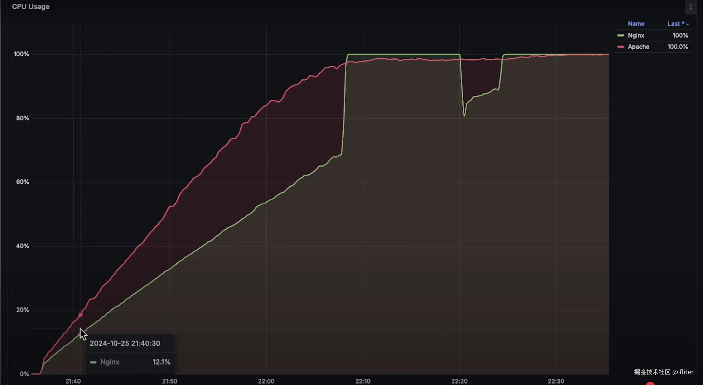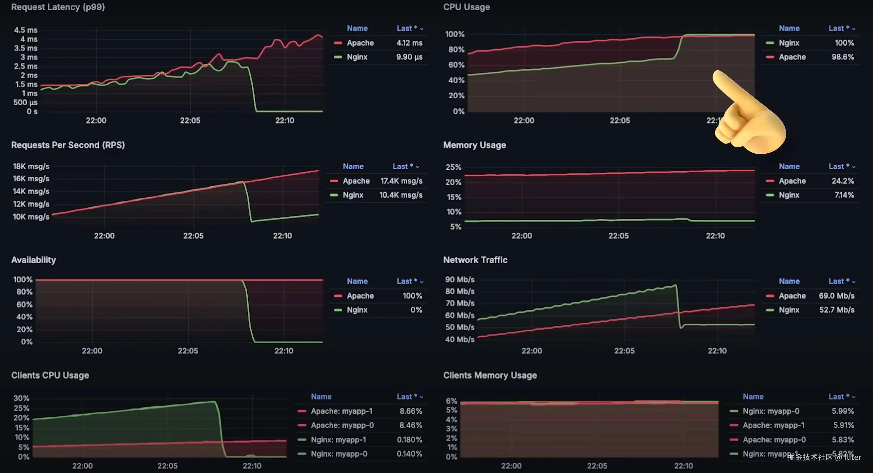 令人惊讶的是,Apache 在这个测试中表现非常好。它的延迟甚至比 Nginx 更低,尽管它确实消耗了稍微多一点的 CPU。真正让我惊讶的是,Nginx 后面应用程序的 CPU 使用率远高于 Apache 后面的应用程序。如果有人能解释这一点,请告诉我。