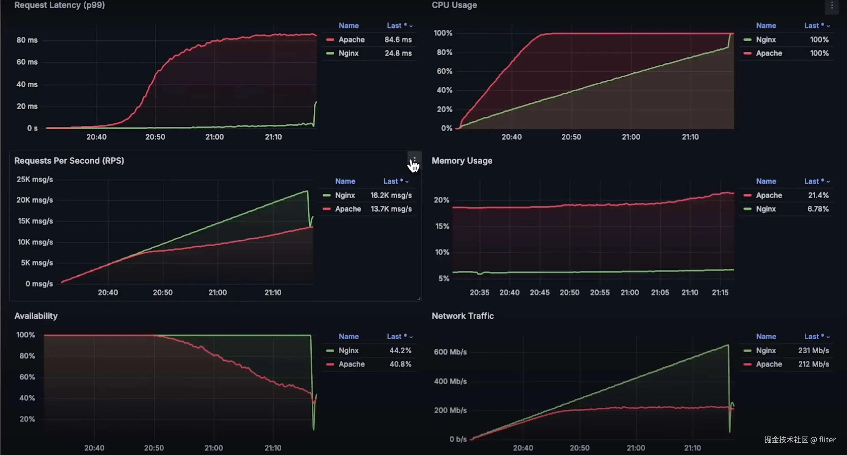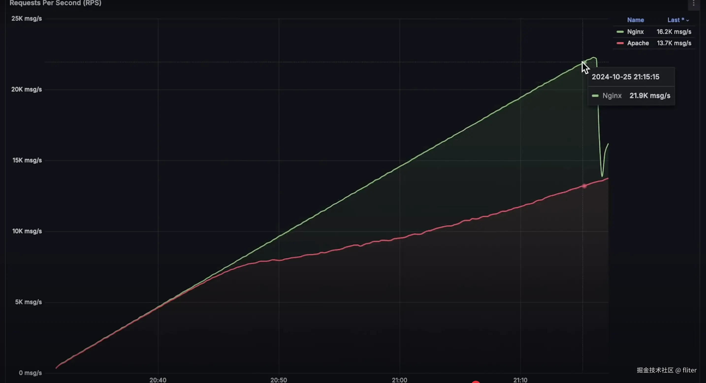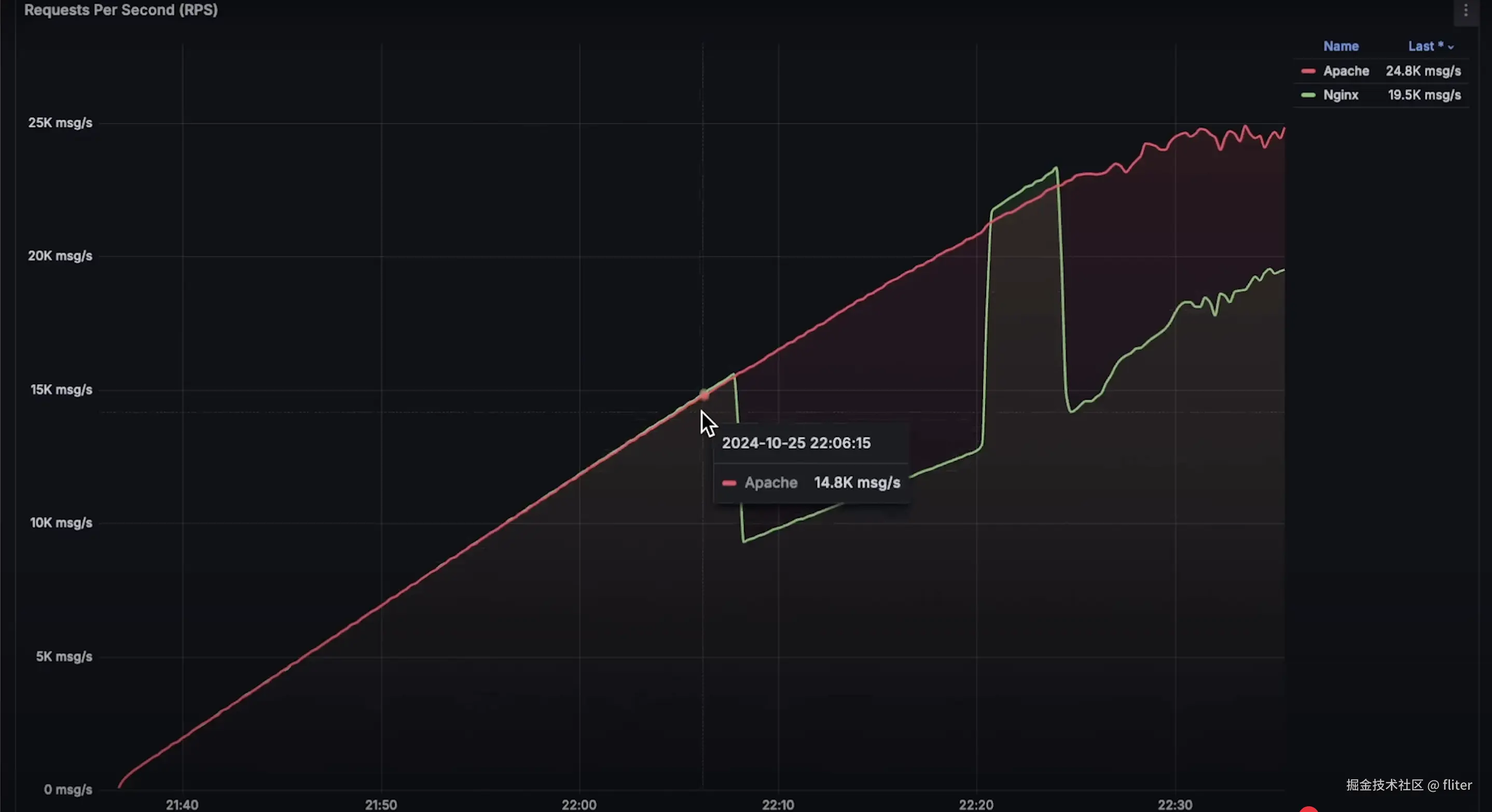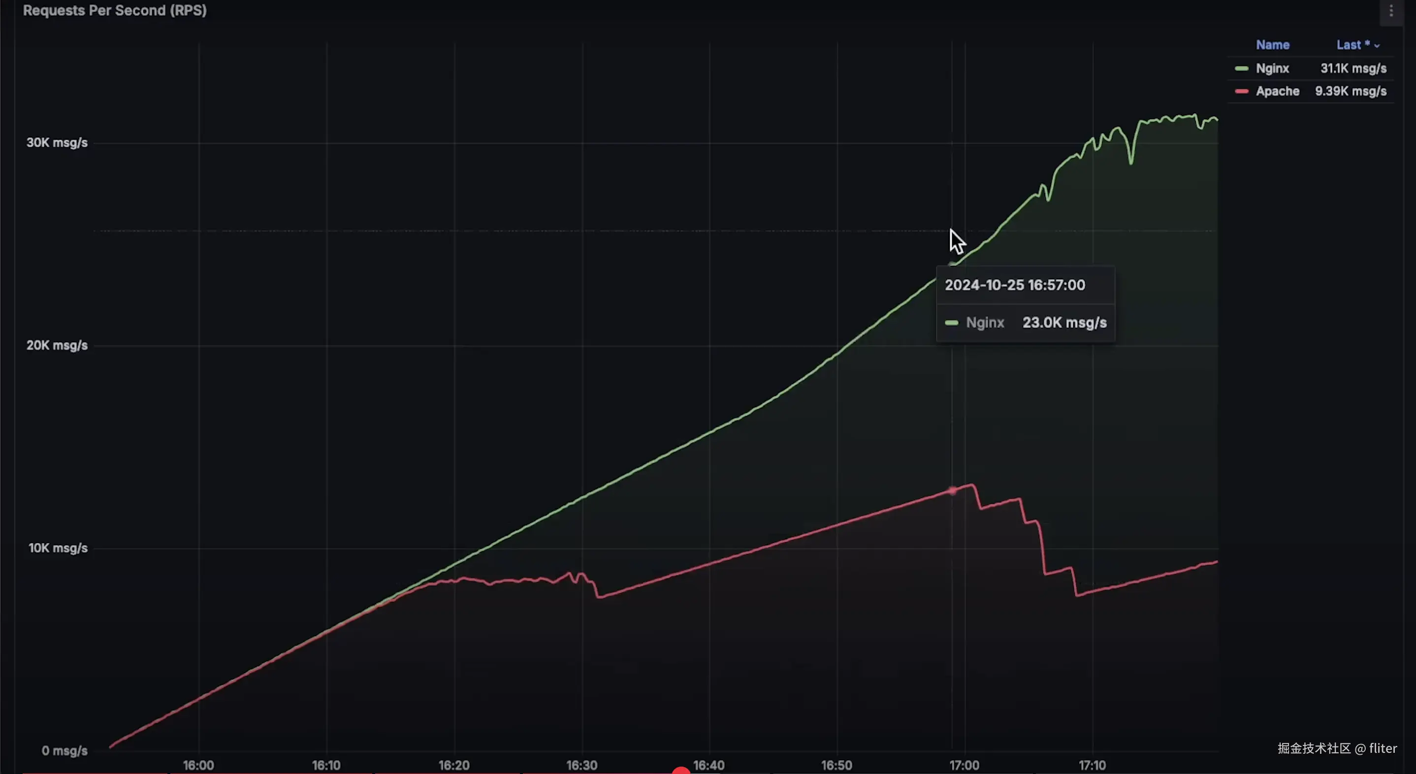 现在,让我打开整个测试期间的每个图表。首先是每秒请求数图。Apache 在大约 8,000 RPS 时开始性能下降,而 Nginx 一直坚持到大约 32,000 RPS。