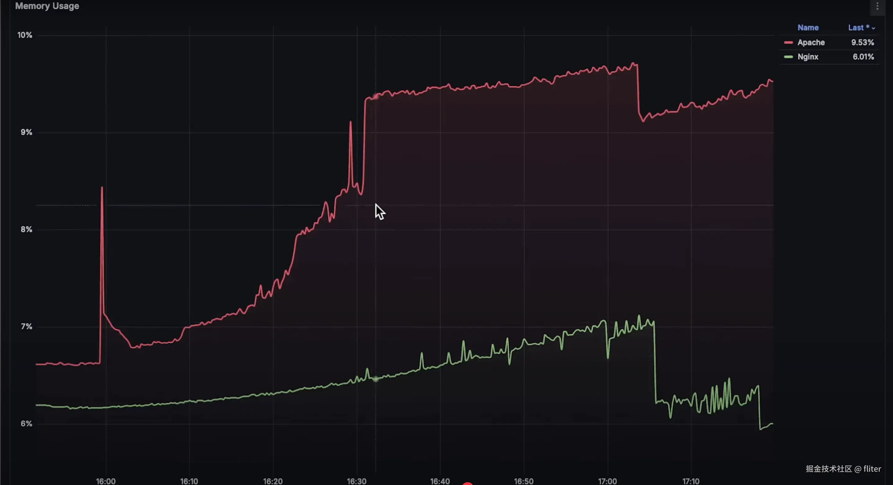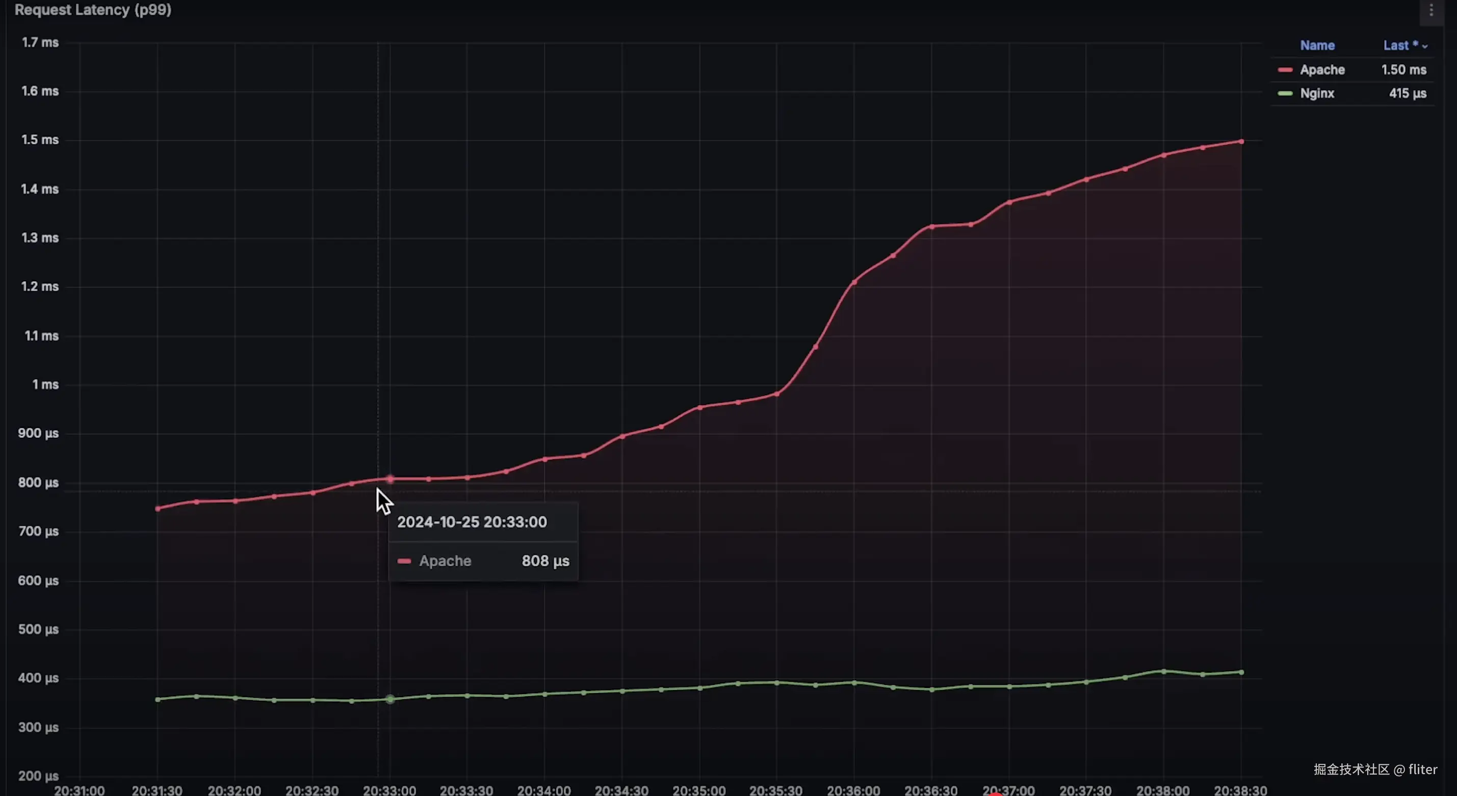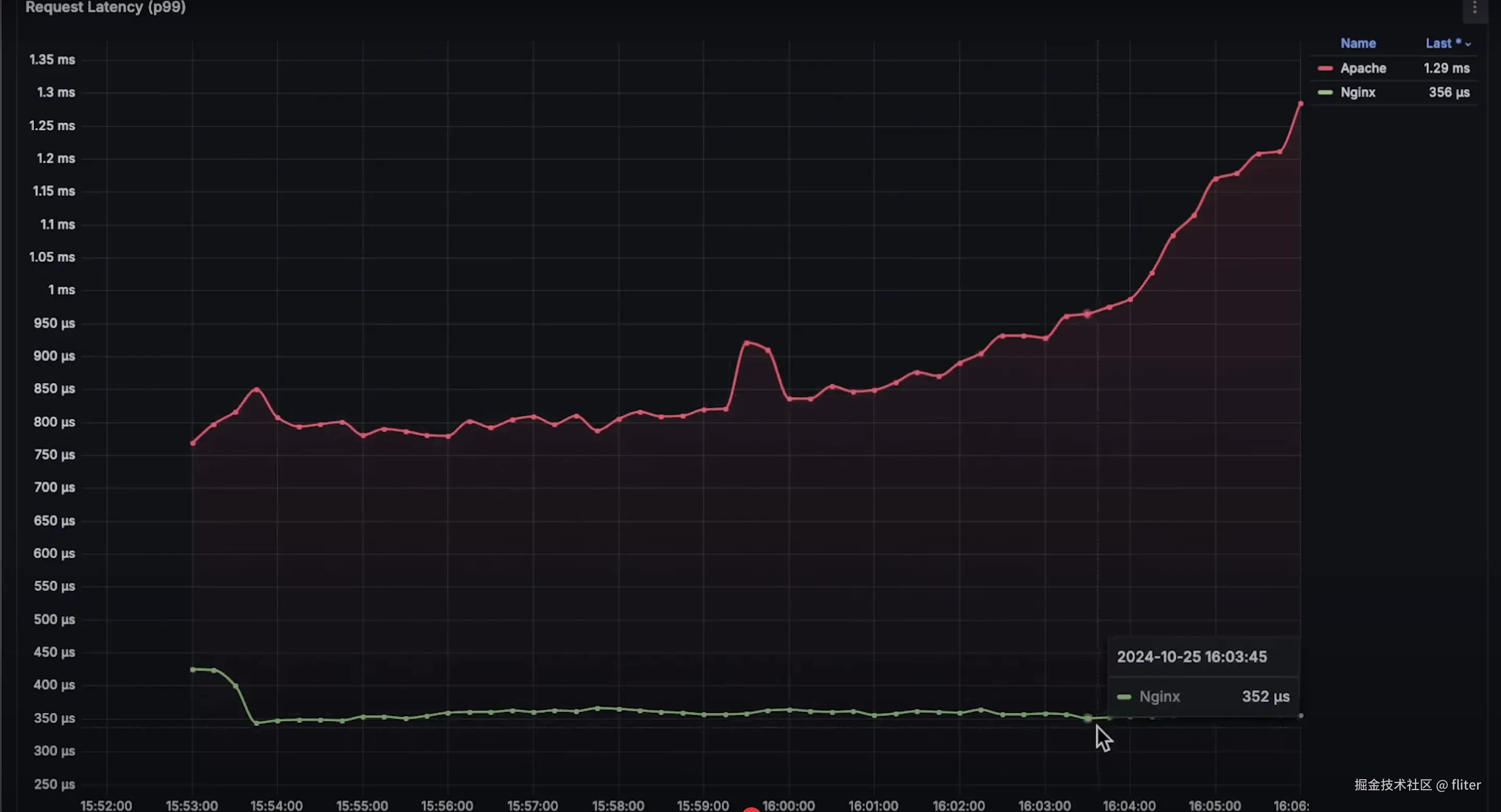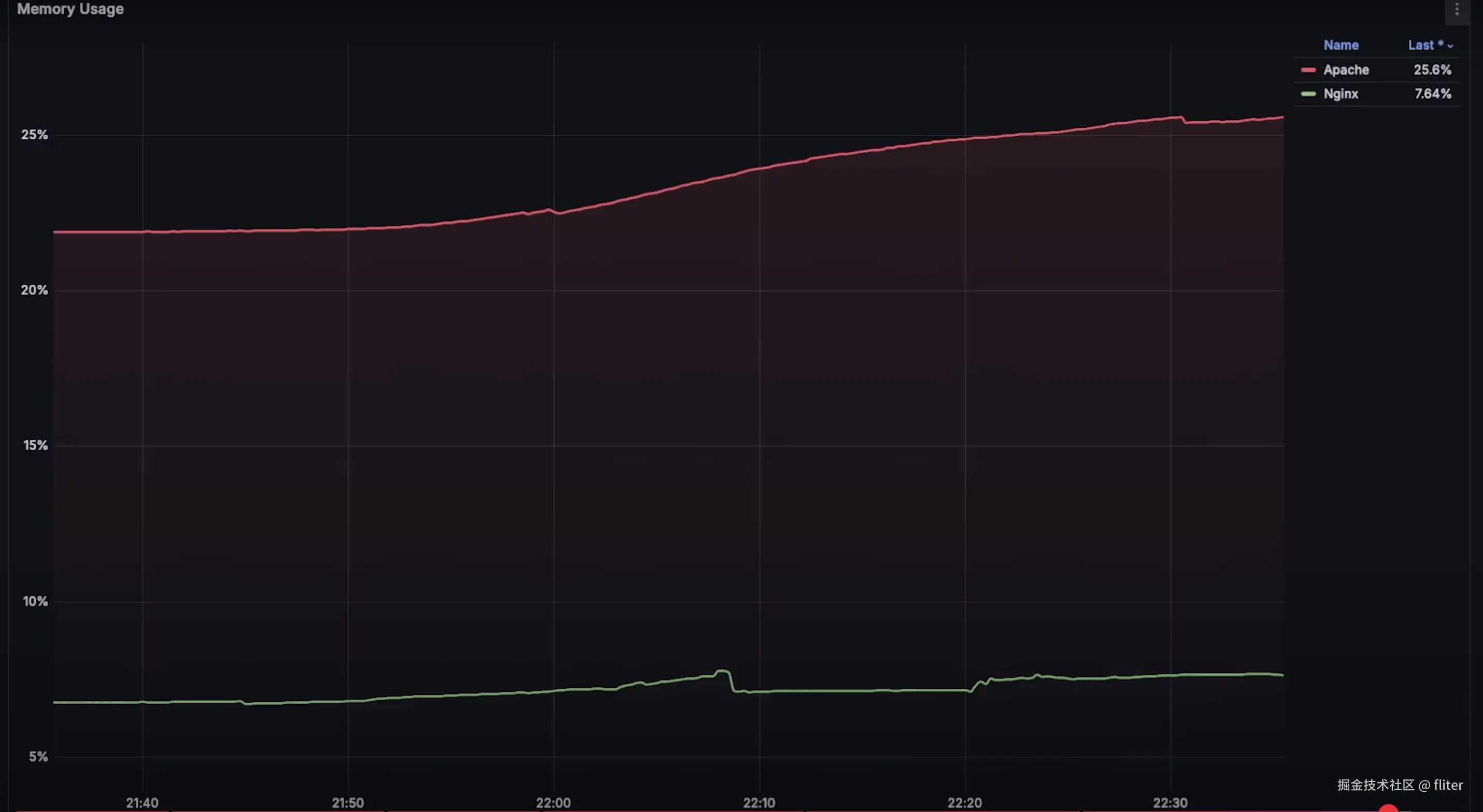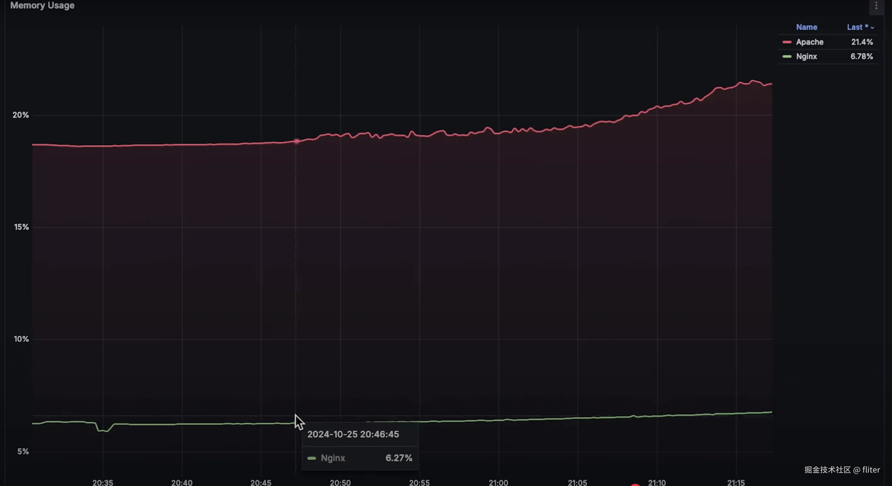 现在,让我打开整个测试期间的每个图表。首先是每秒请求数图。Apache 在大约 8,000 RPS 时开始性能下降,而 Nginx 一直坚持到大约 32,000 RPS。