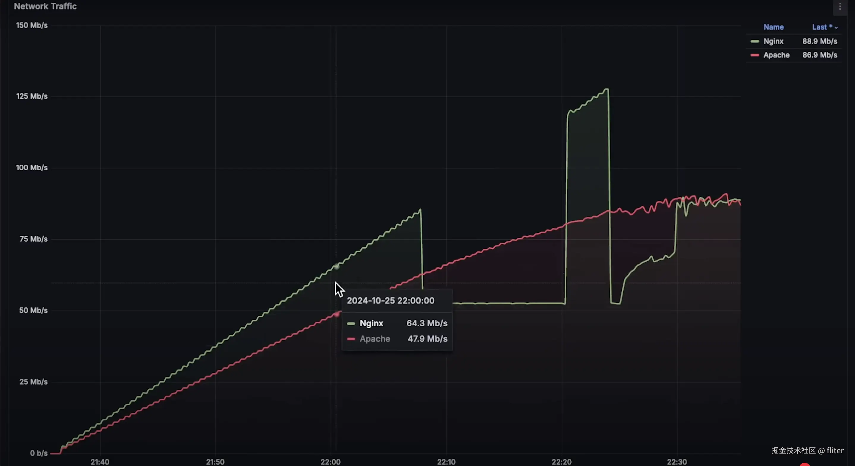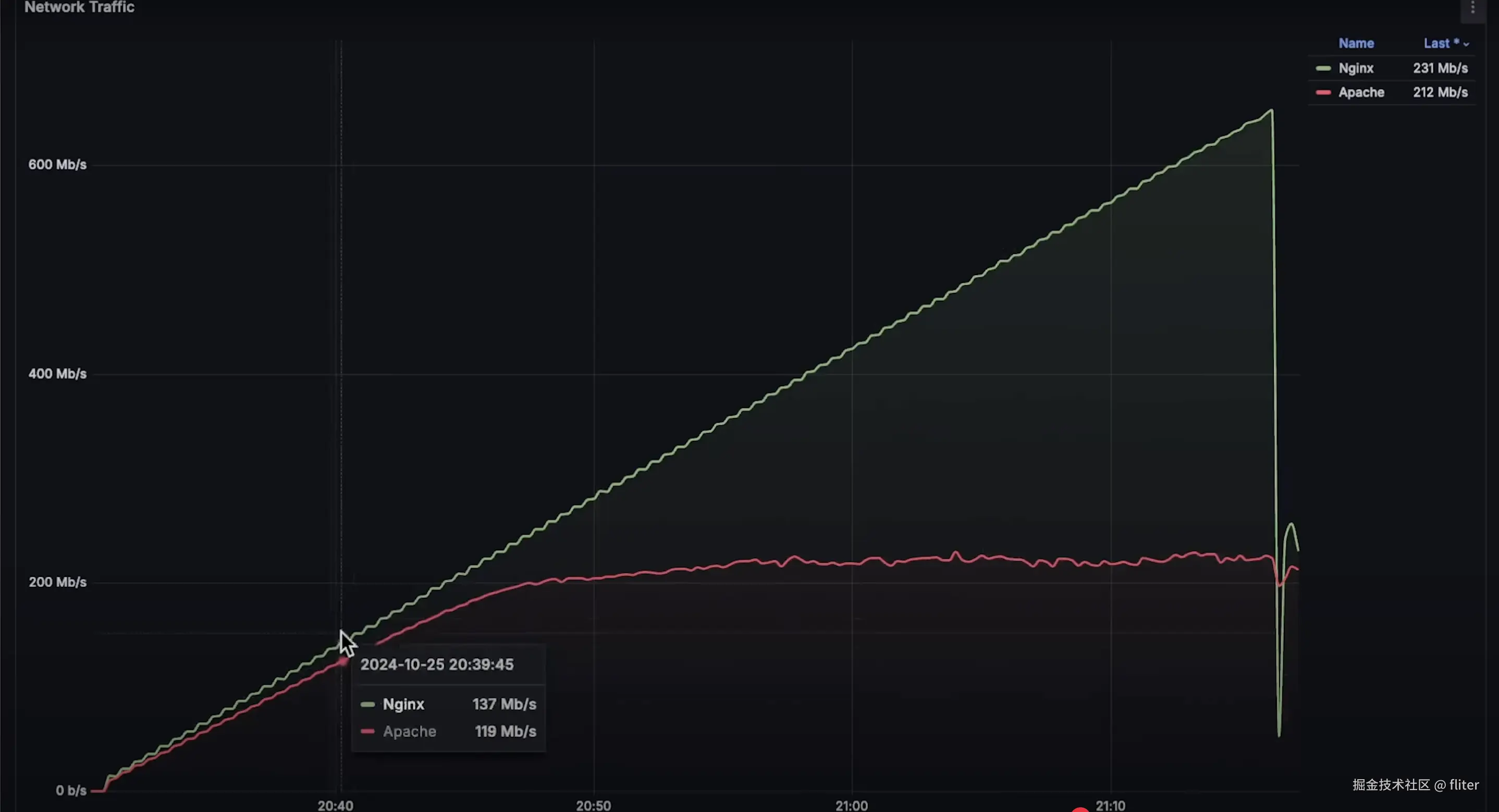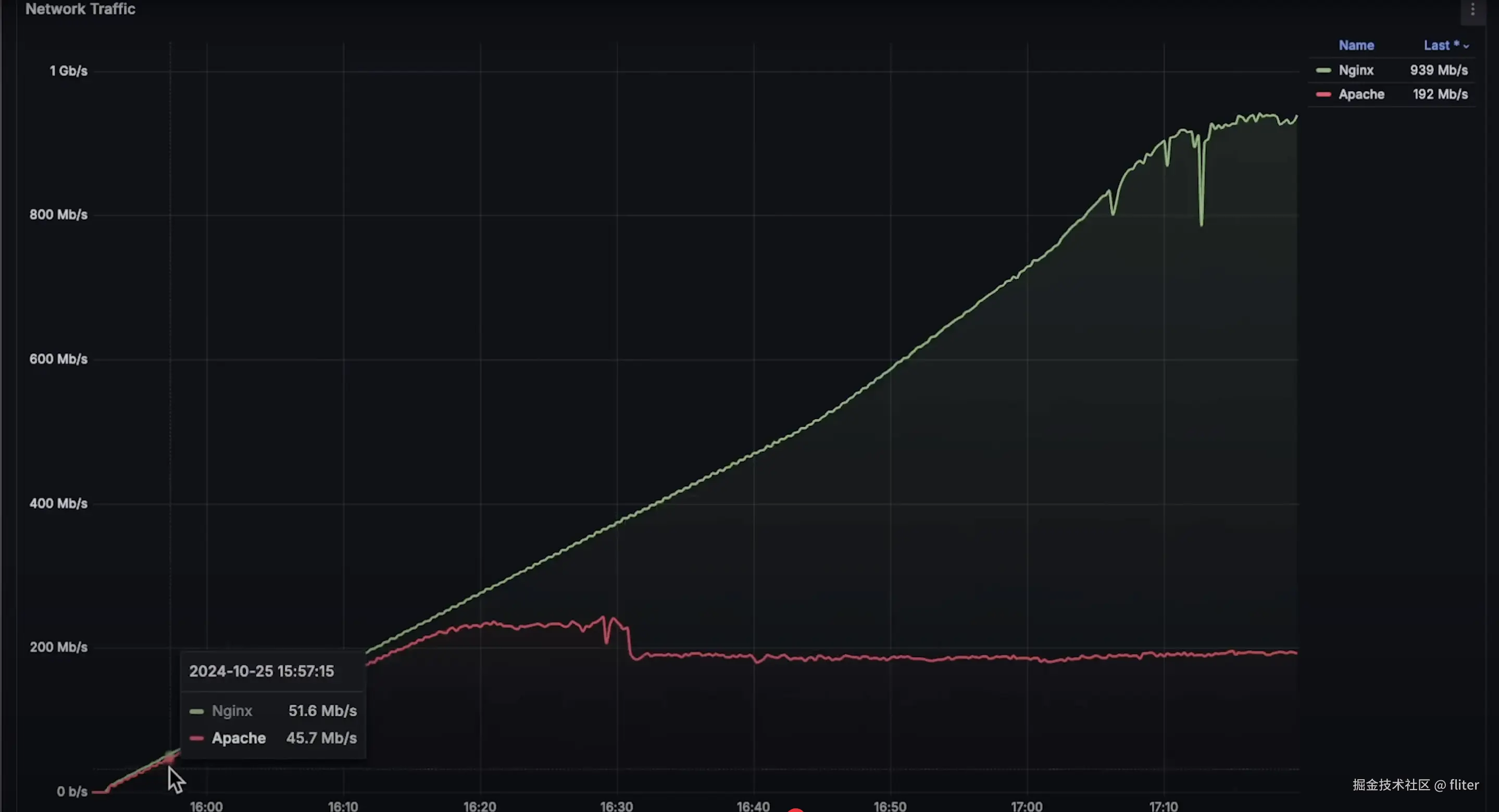 最后,我们有网络使用情况。在峰值时,Nginx 每秒可以向客户端传输近 1 GB 的数据。