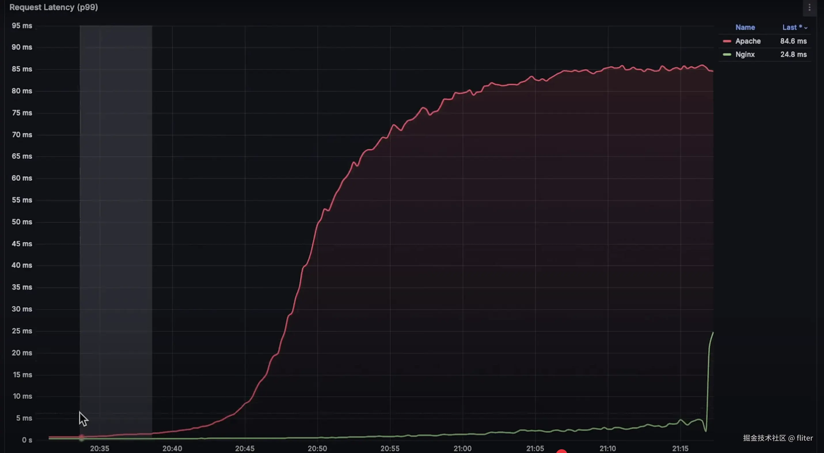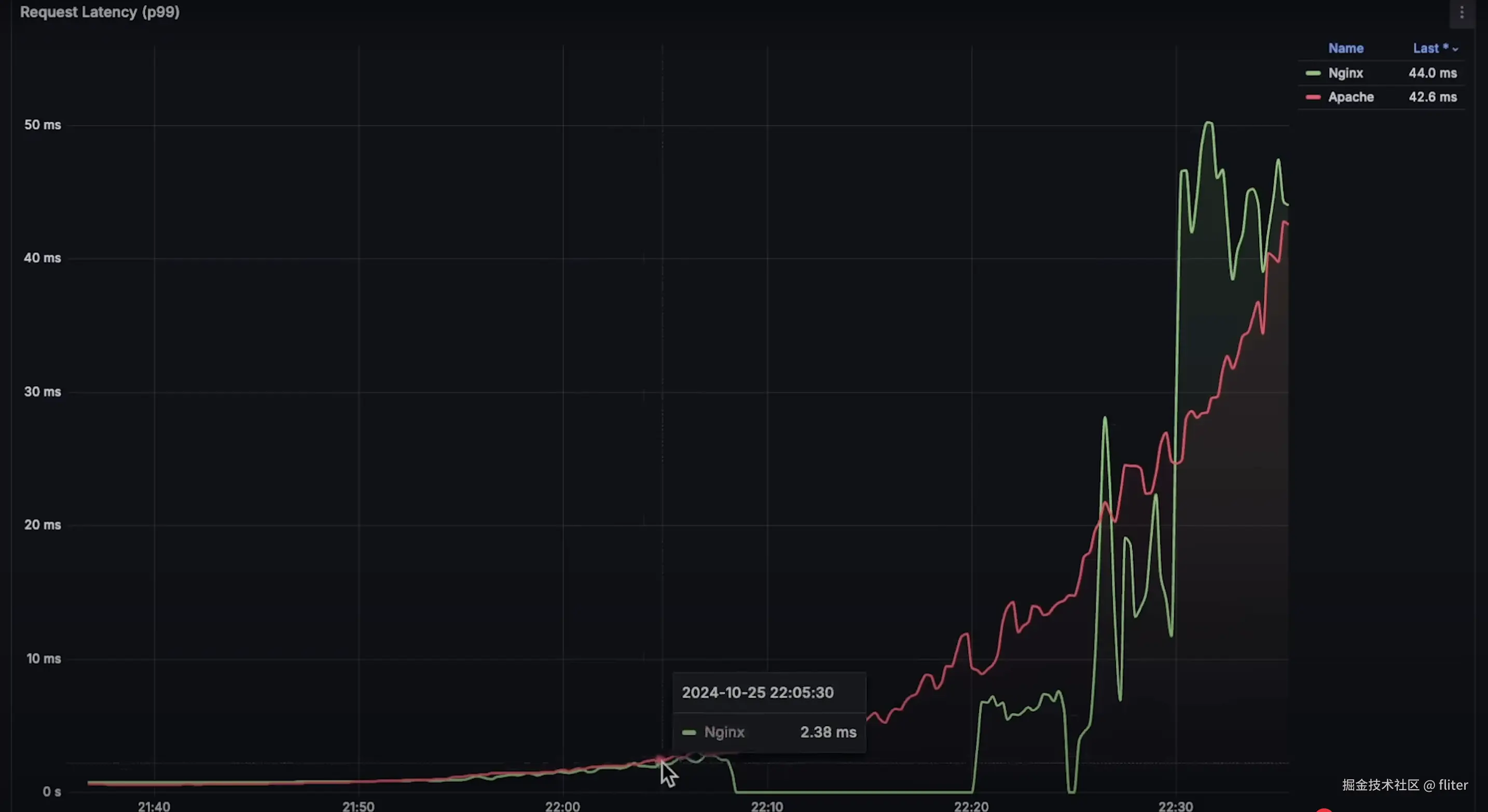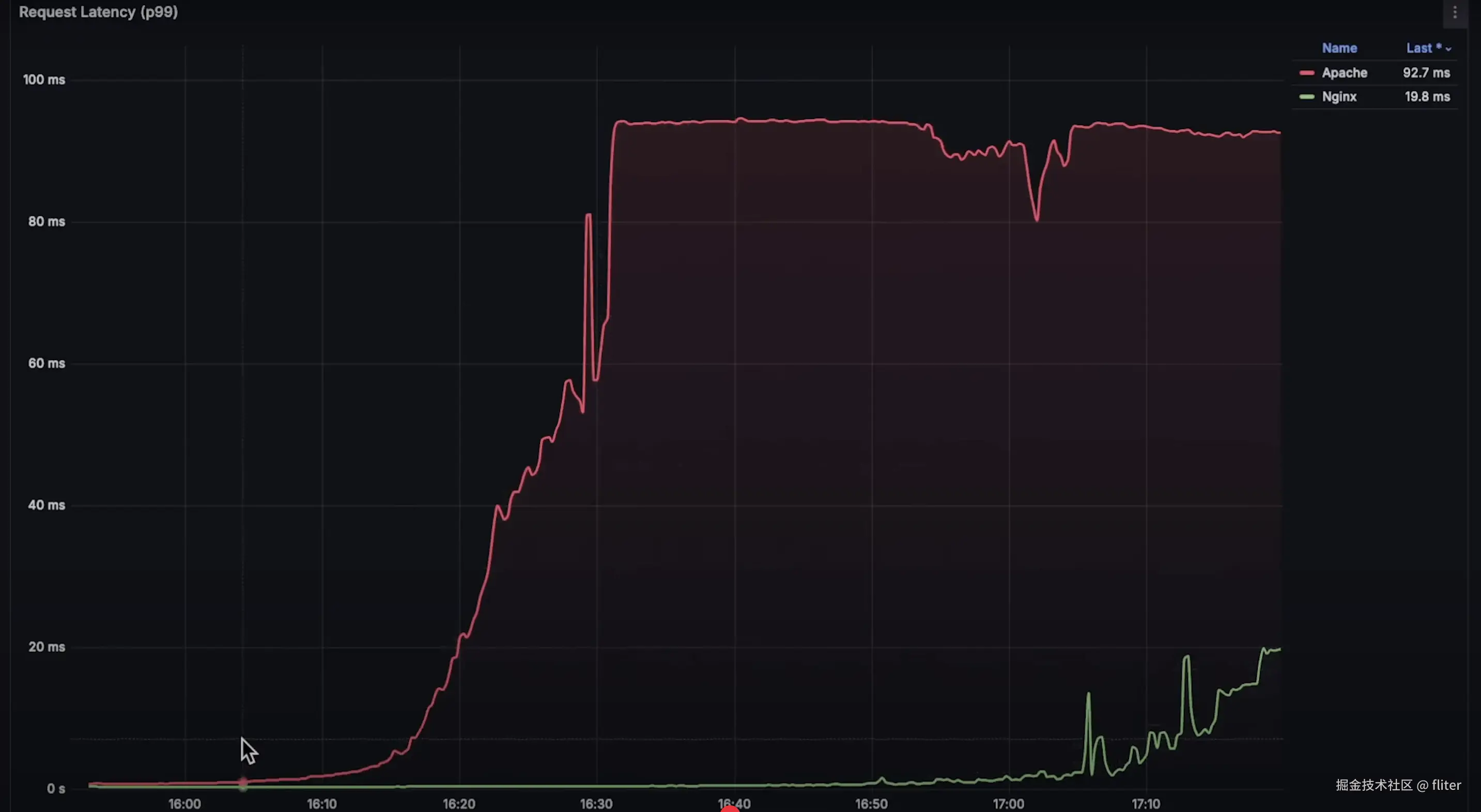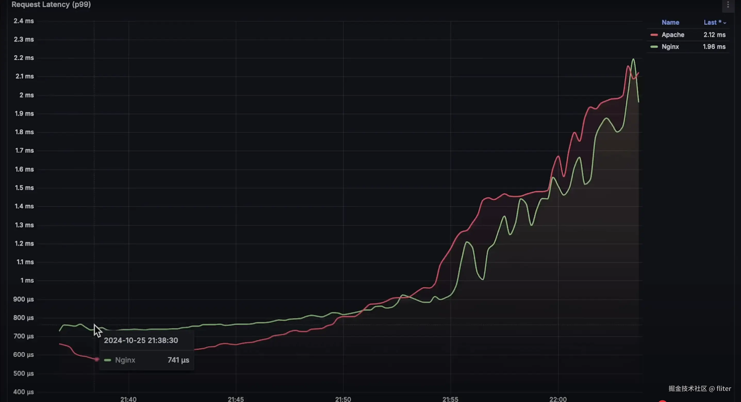 从延迟图中,你可以看到 Nginx 的表现仍然非常好,延迟几乎与上一个测试相同。Apache 的延迟也与上一个测试相似,但并不是以好的方式相似。