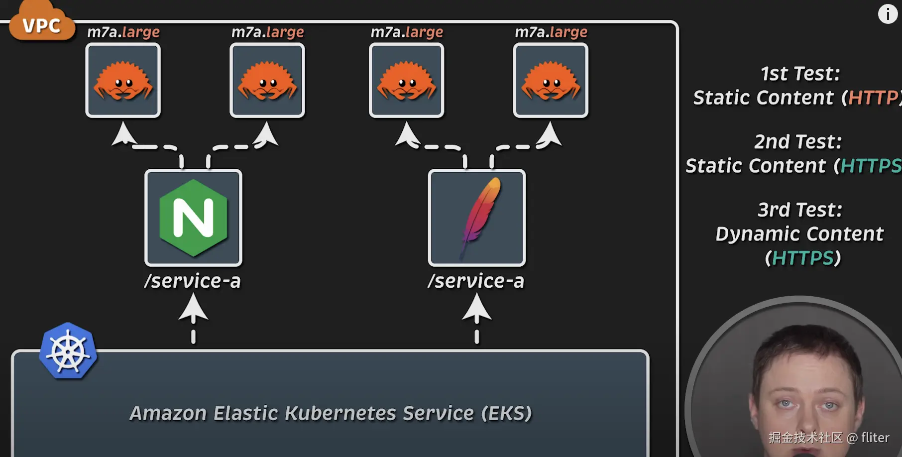 为了运行这些测试,我使用了 AWS。我部署了大型独立 EC2 实例来运行 Nginx 和 Apache,并创建了一个包含 4xlarge Graviton 实例的 EKS 集群,用于运行生成负载的我的客户端。此外,对于第三个测试,我使用大型 EC2 实例来托管这些代理后面的应用程序。