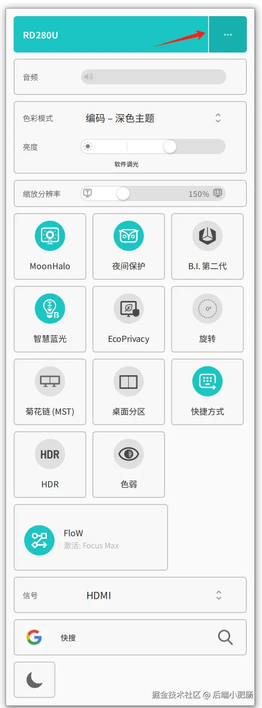在编程过程中,快速访问常用功能对于提高工作效率至关重要。RD280U显示器在其下边框(即“小下巴”)巧妙地设计了专属编程触键区域,配备了LED指示灯和可自定义的快捷按键。我们可以根据个人需求,一键调节显示器的个性化参数,轻松切换到专属的编程模式。这一设计使操作更加直观便捷,极大提升了编程过程中的效率和舒适度。