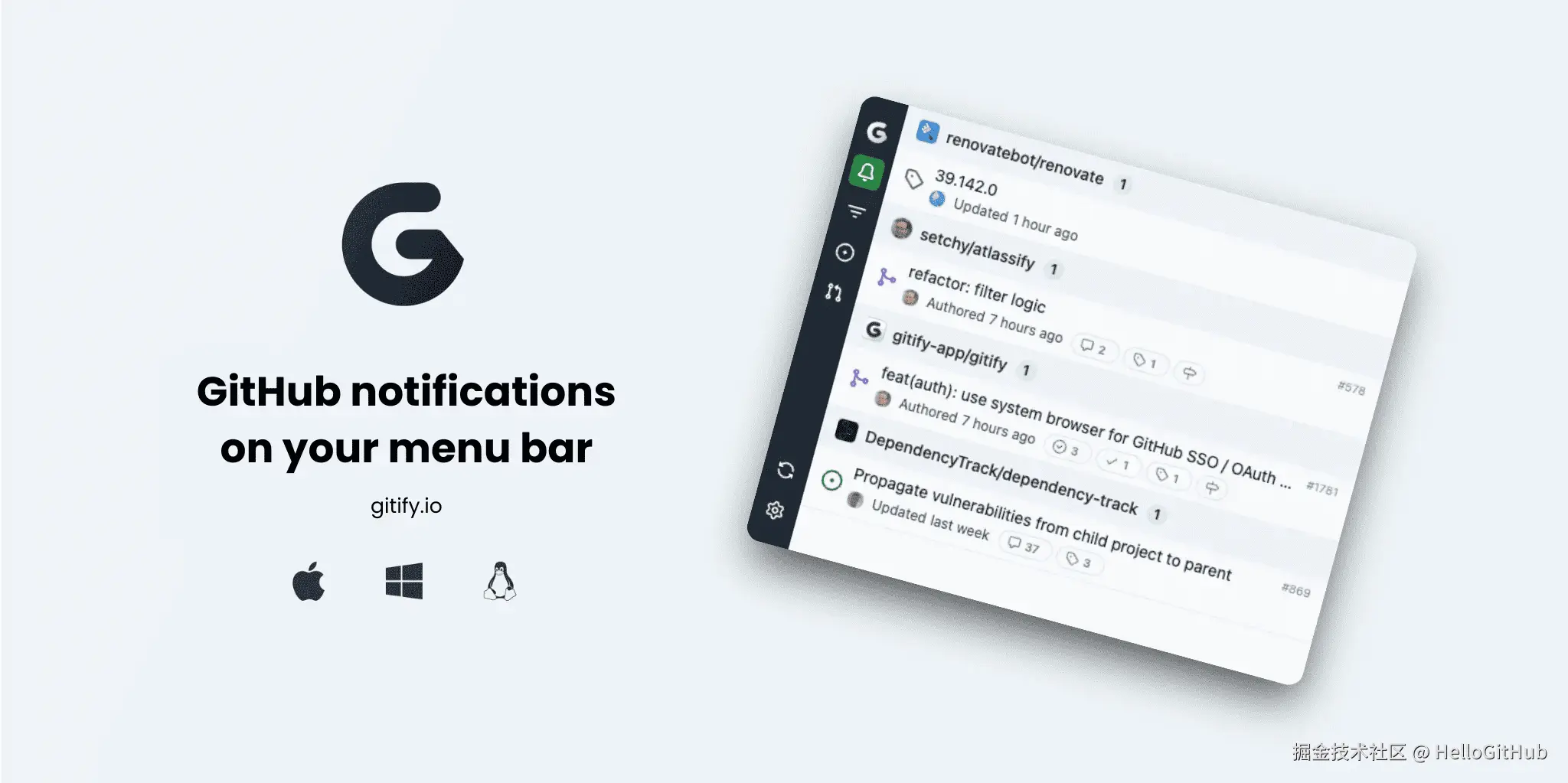 这是一款开源免费的 GitHub 通知管理工具,可以将 GitHub 通知集成到用户的菜单栏,支持 Windows、Linux 和 macOS 平台。