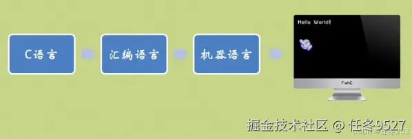 C语言代码文件经过C语言编译器编译成汇编语言,再编译为机器语言,最后交给CPU执行。