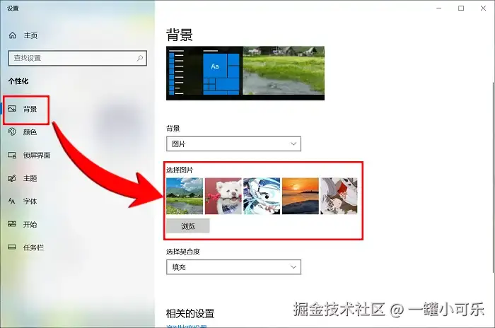 步骤2:在个性化设置中,左侧栏选择 “背景” ,然后点击 “浏览” ,选择本地磁盘里的图片作为壁纸就可以了。