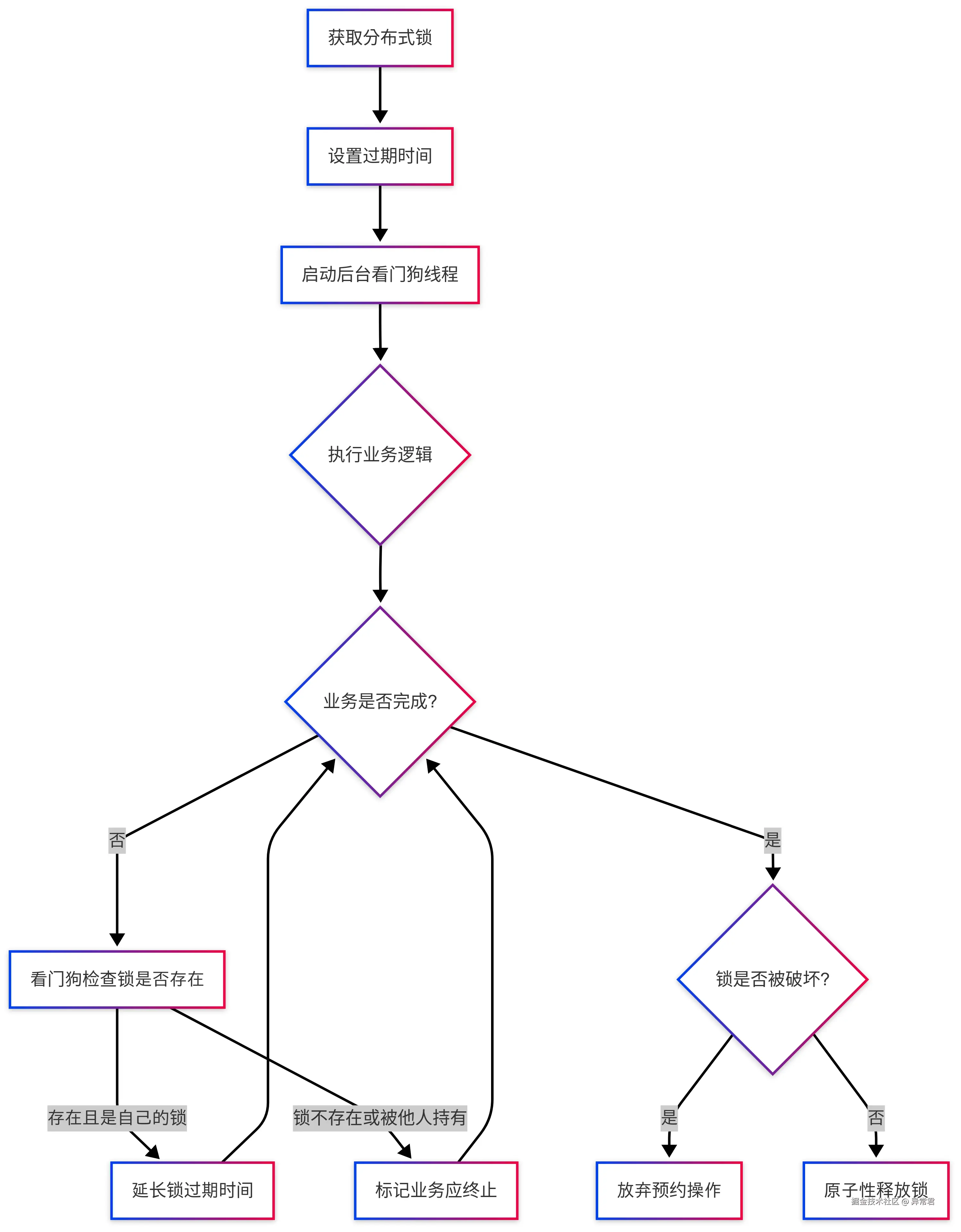 | 手动看门狗 | 自动延期 | 通用场景 | 守护线程定期续期,注意异常处理 |