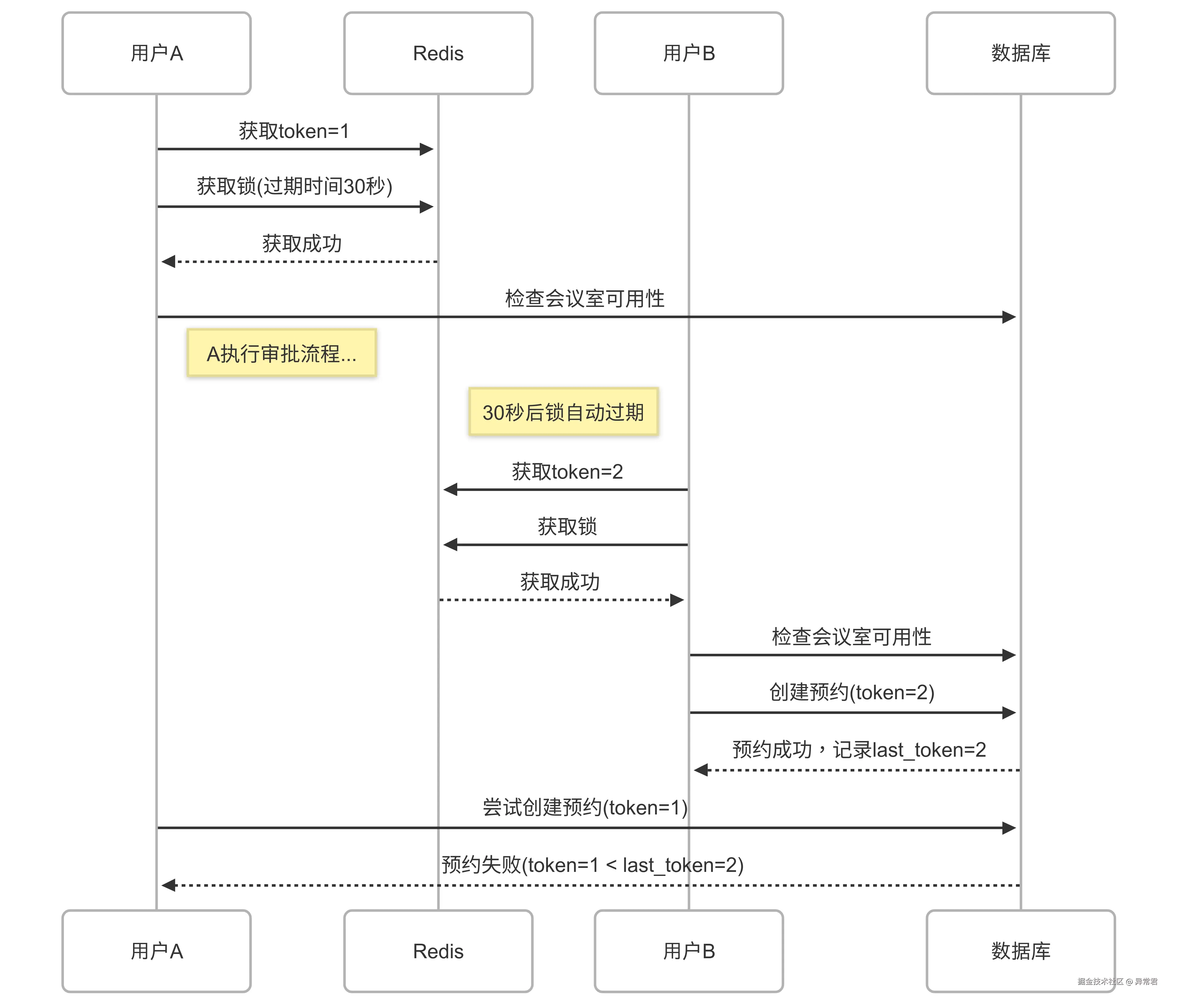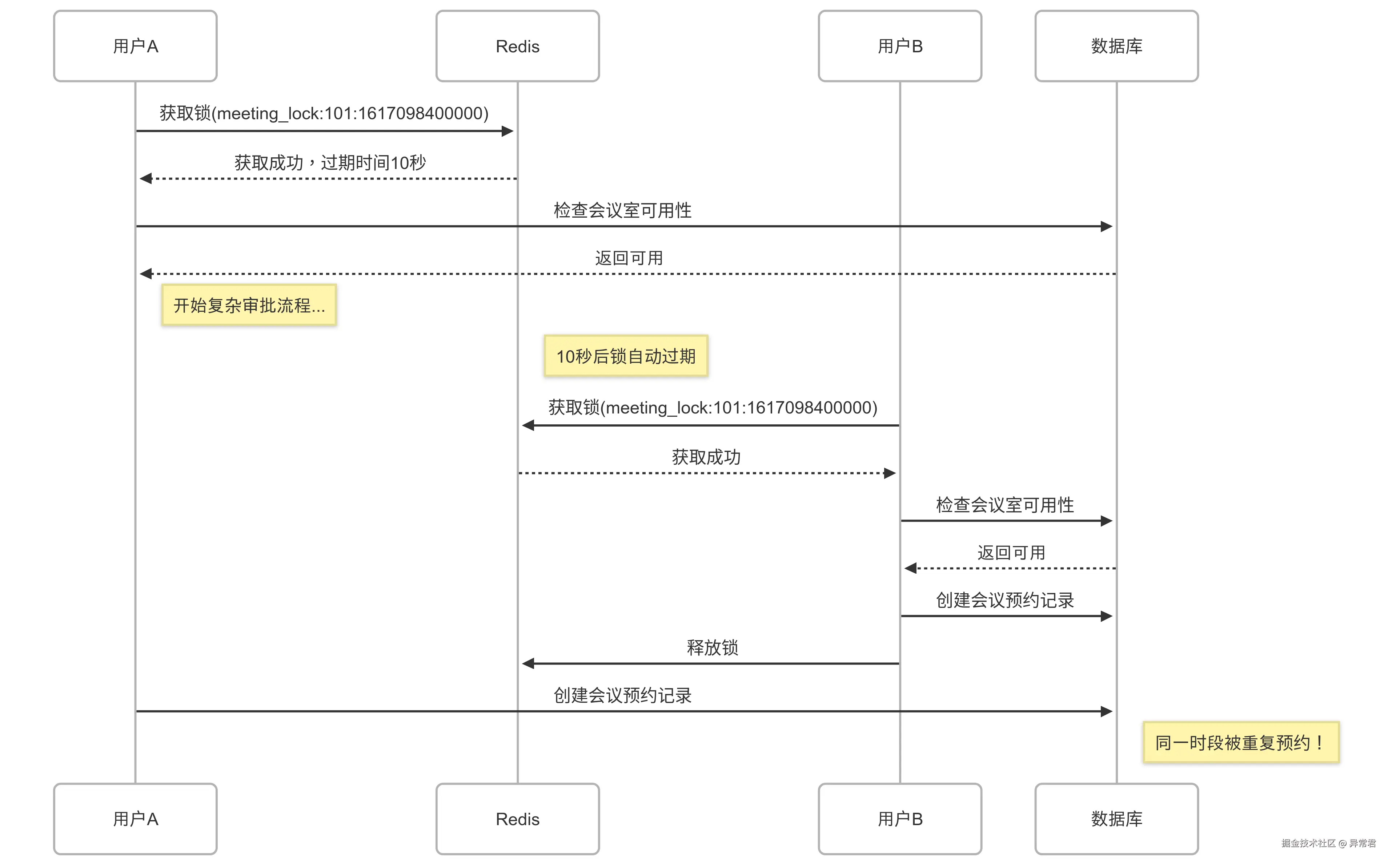 问题出在哪里?用户 A 申请预约会议室,获取锁后开始执行预约逻辑,包括审批流程等,这些操作耗时 15 秒。但锁只设置了 10 秒过期时间,10 秒后锁自动释放,用户 B 获取锁并开始预约流程。当用户 A 完成审批、创建预约记录时,它不知道锁已过期,仍会继续创建预约,导致同一时段被两人预约。