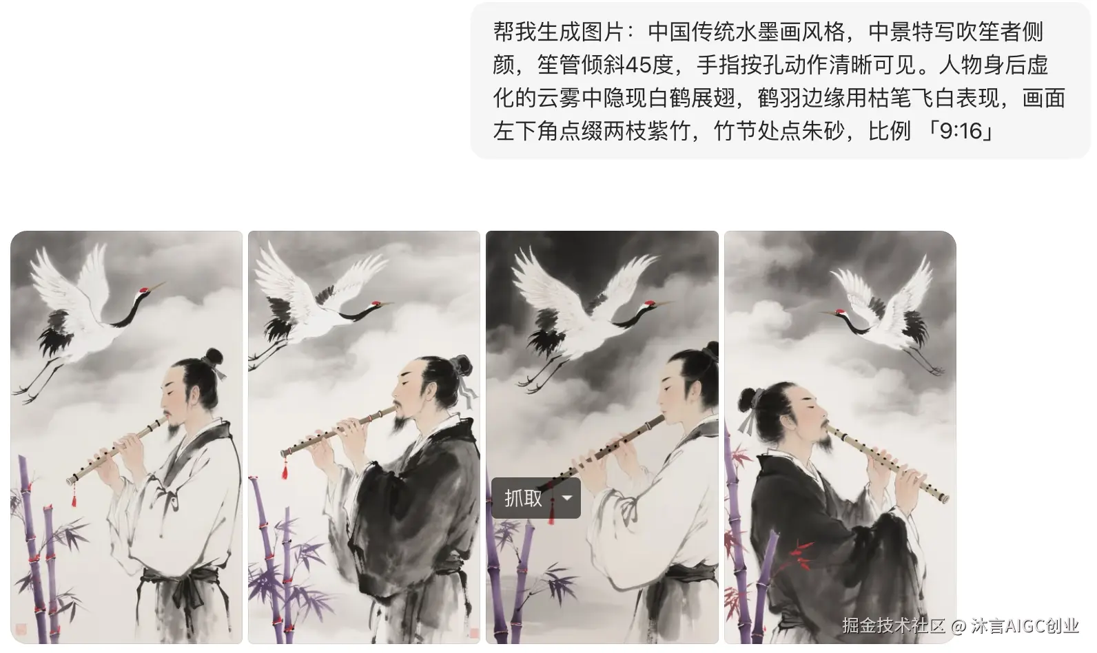 中国传统水墨画风格,中景特写吹笙者侧颜,笙管倾斜45度,手指按孔动作清晰可见。人物身后虚化的云雾中隐现白鹤展翅,鹤羽边缘用枯笔飞白表现,画面左下角点缀两枝紫竹,竹节处点朱砂