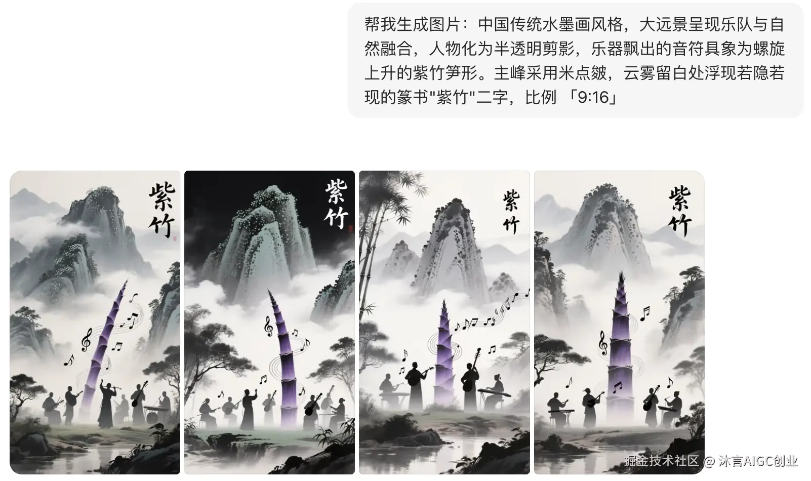 中国传统水墨画风格,大远景呈现乐队与自然融合,人物化为半透明剪影,乐器飘出的音符具象为螺旋上升的紫竹笋形。主峰采用米点皴,云雾留白处浮现若隐若现的篆书"紫竹"二字