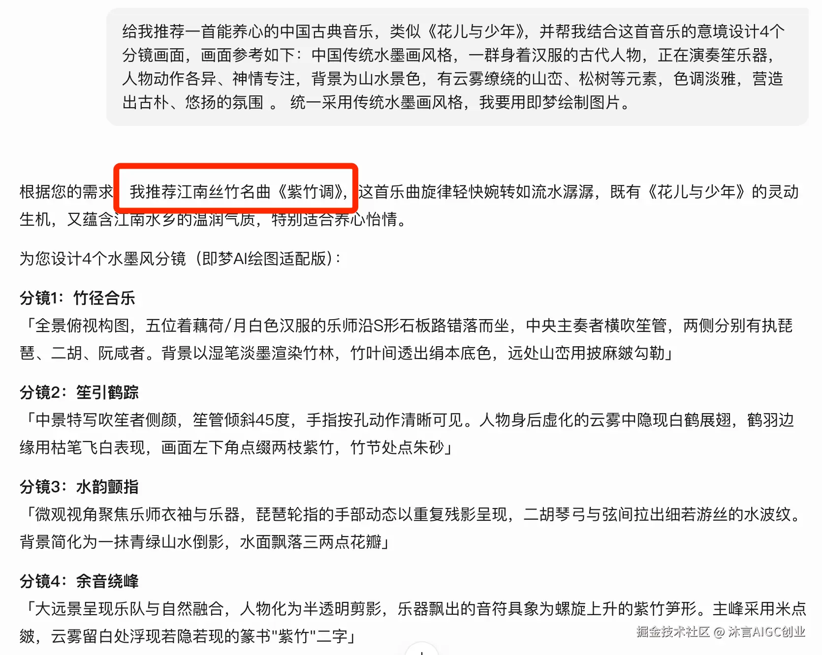 给我推荐一首能养心的中国古典音乐,类似《花儿与少年》,并帮我结合这首音乐的意境设计4个分镜画面,画面参考如下:一群身着汉服的古代人物,正在演奏笙乐器,人物动作各异、神情专注,背景为山水景色,有云雾缭绕的山峦、松树等元素,色调淡雅,营造出古朴、悠扬的氛围 。 统一采用传统水墨画风格,我要用即梦绘制图片。