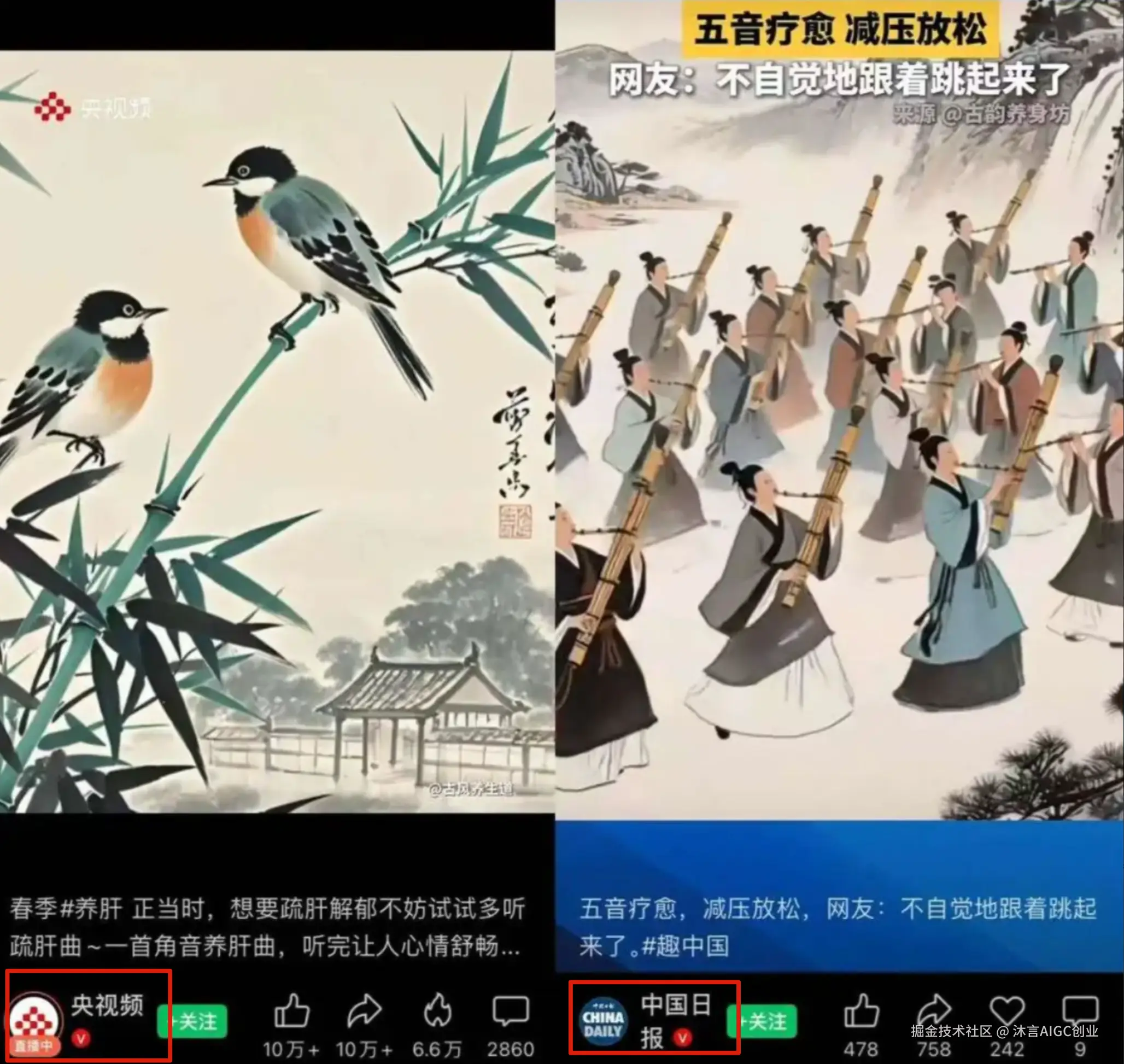 最近刷短视频,有没有被古风五音养生疗愈视频击中?画面里,或鸟儿灵动,或古人奏乐,配上养生旋律,让人身心舒畅。就连主流媒体央视频、中国日报都在转发这样的短视频。