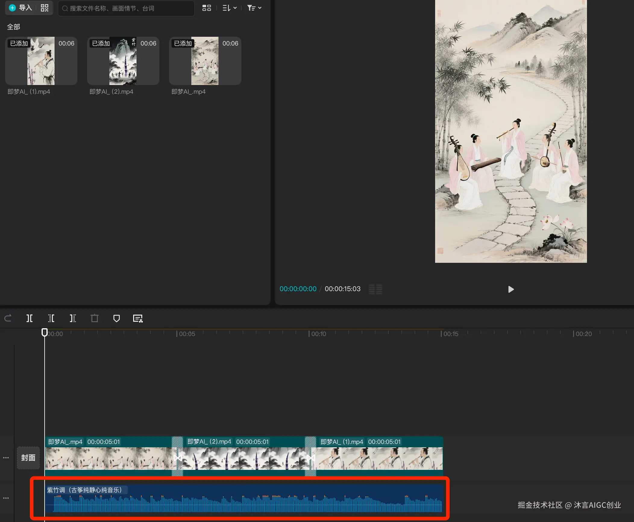 剪辑这里我们只需要添加背景音乐和画面转场即可,背景音乐在第一步“腾讯元宝生成分镜”时Deepseek已经帮我们推荐了背景音乐,我们直接使用即可。