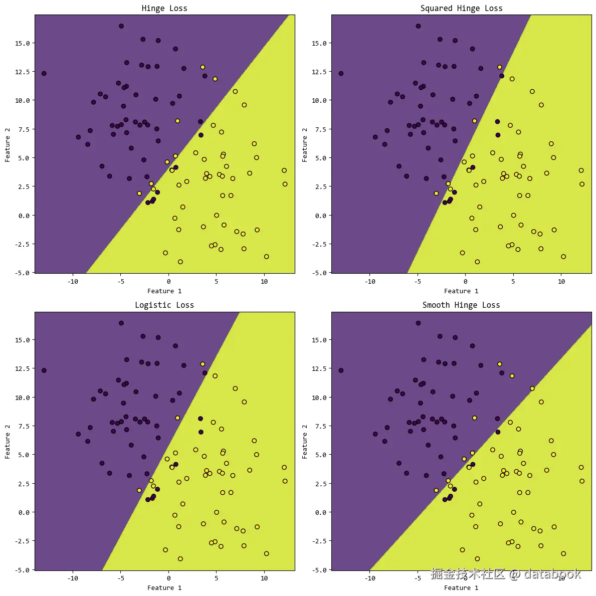 Squared Hinge Loss 对噪声和异常值的惩罚更重,可能导致模型对这些点更敏感。
