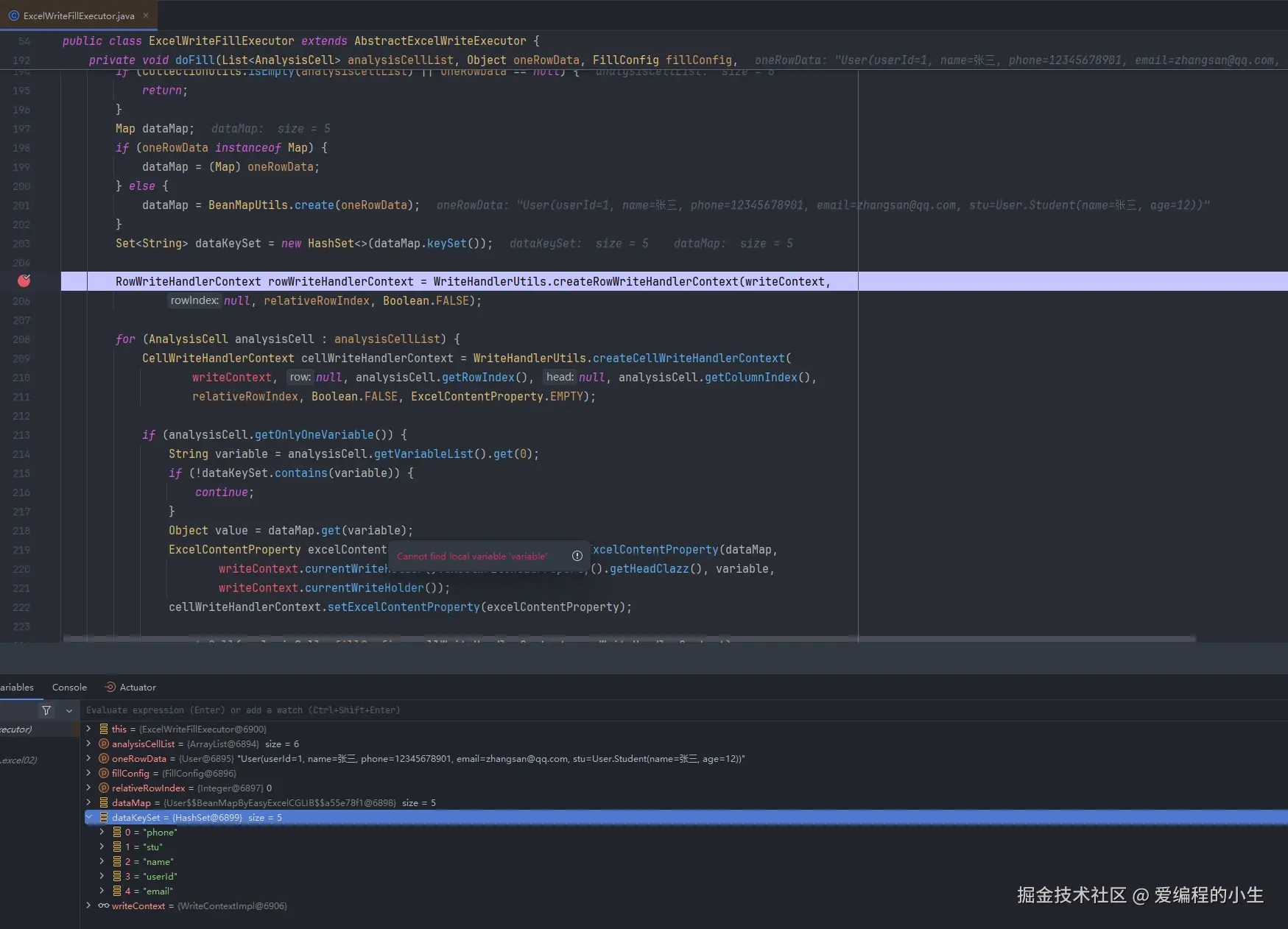 在 com.alibaba.excel.write.executor 包下创建 ExcelWriteFillExecutor 类,跟源码中的类名称一致,尝试修改 analysisCell.getOnlyOneVariable()方法中的逻辑以便支持嵌套对象,修改如下: