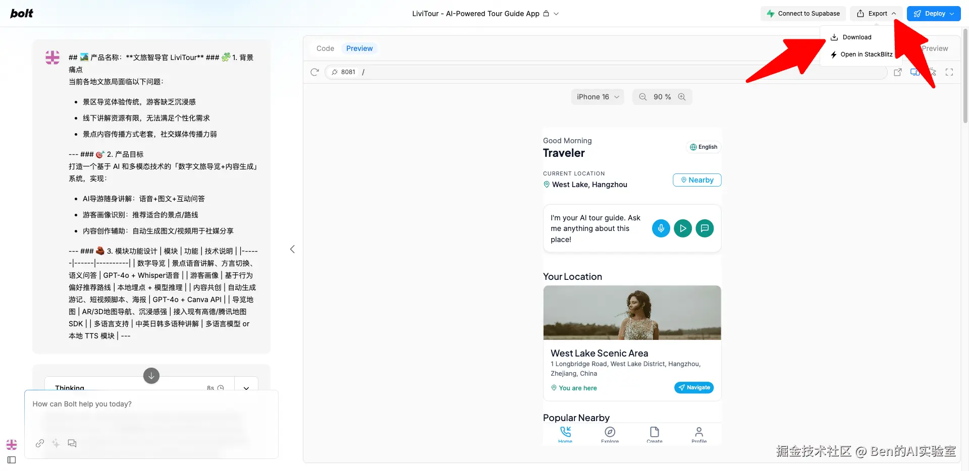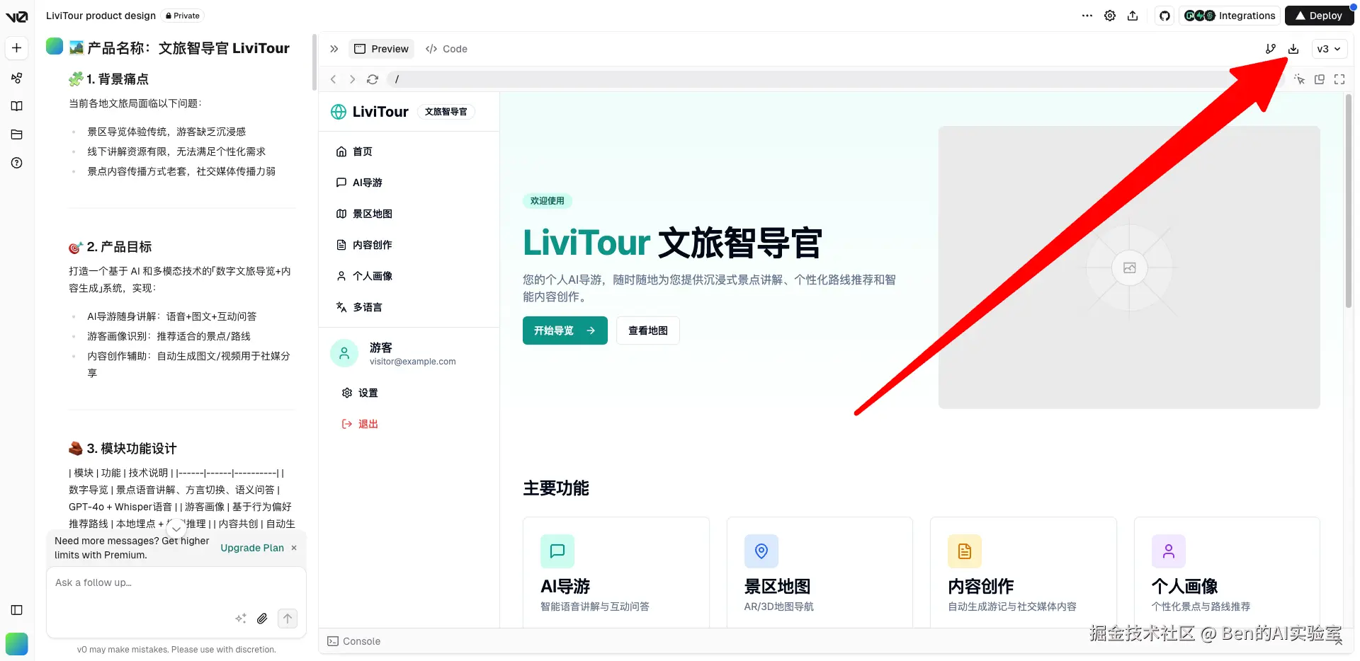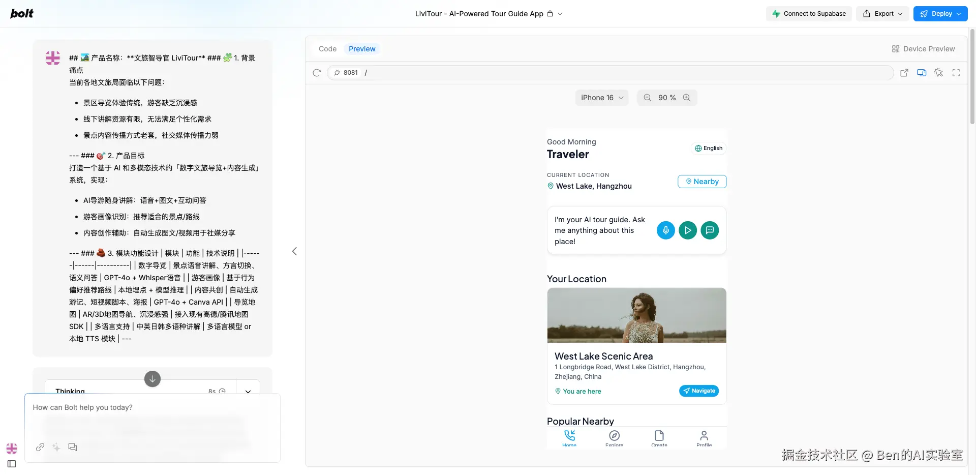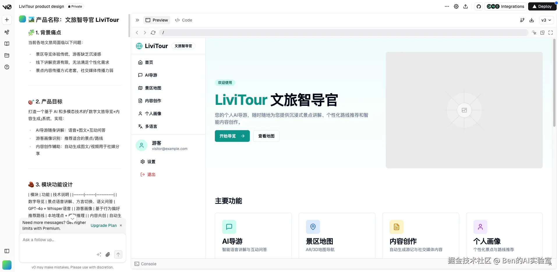 将上一步AI输出的产品设计方案交给原型构建工具:Lovable/ v0.dev / bolt.new / Tempo Labs,等待几分钟即可预览产品原型。建议同时使用多种工具生成不同版本的原型,然后从中选择最佳方案。