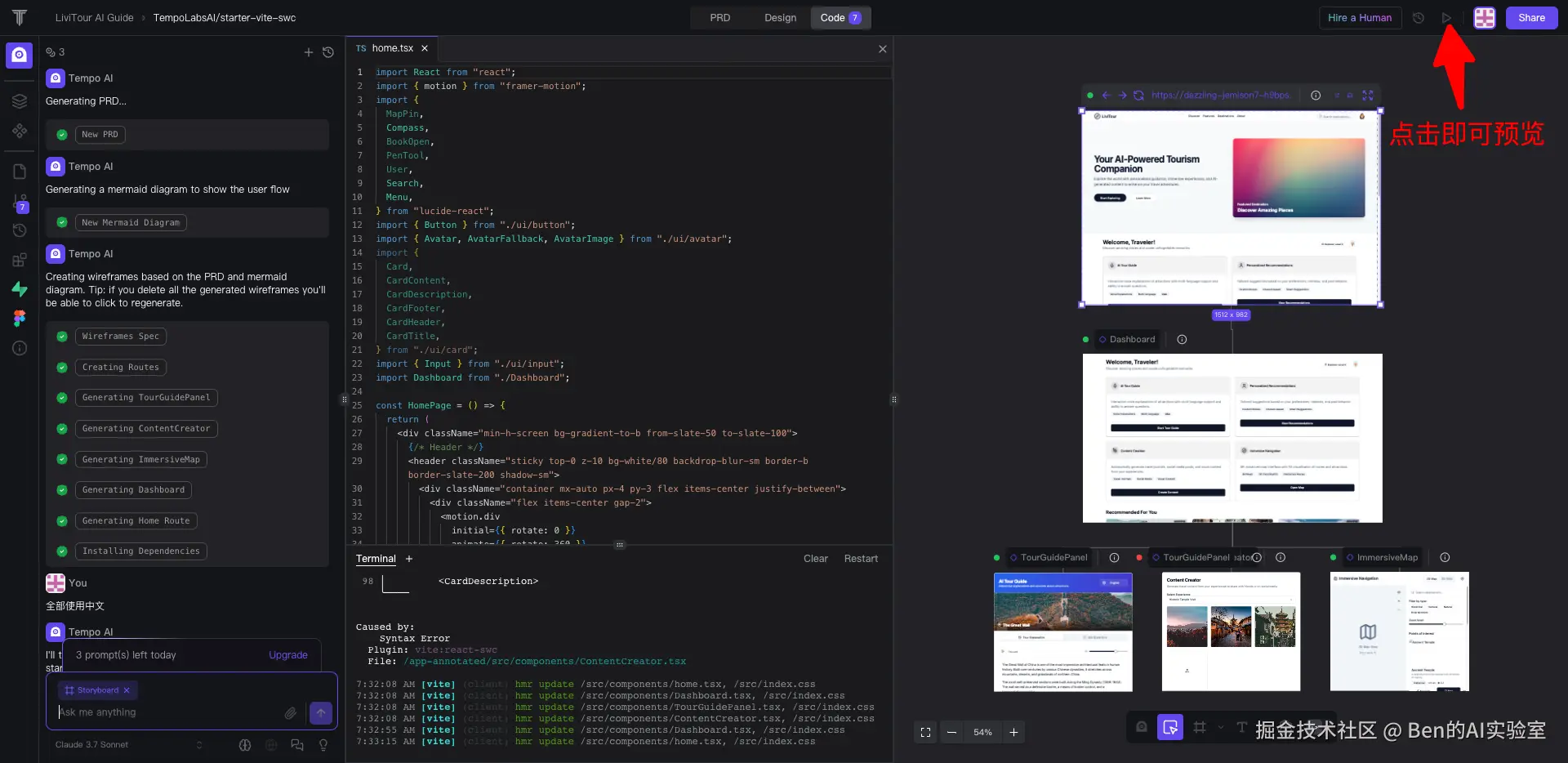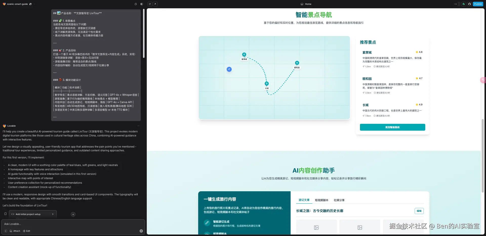 下面是简单的示例,我同时对4个工具下达同样的指令(构建一个文旅智导官),大约3-5分钟就会生成产品原型。