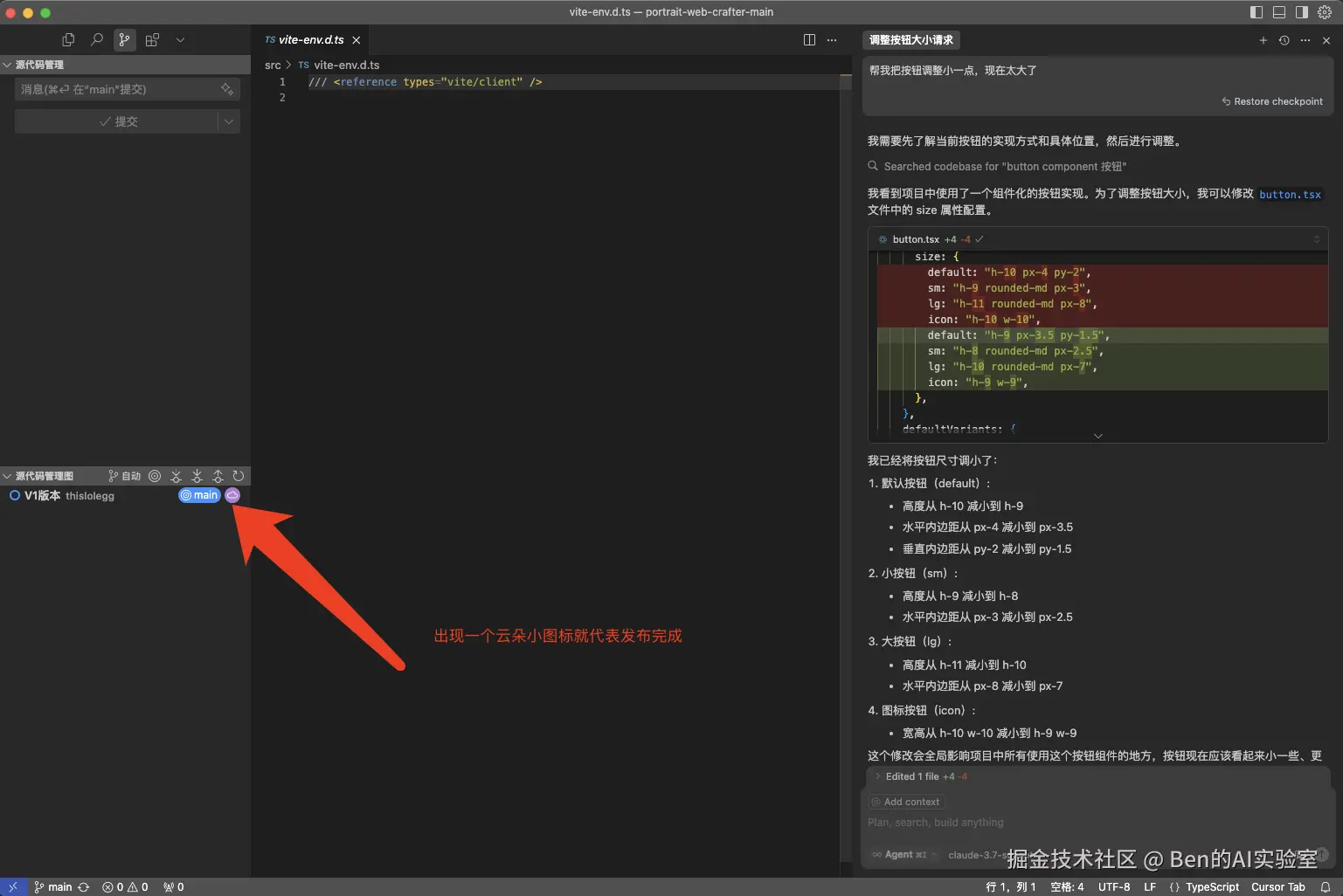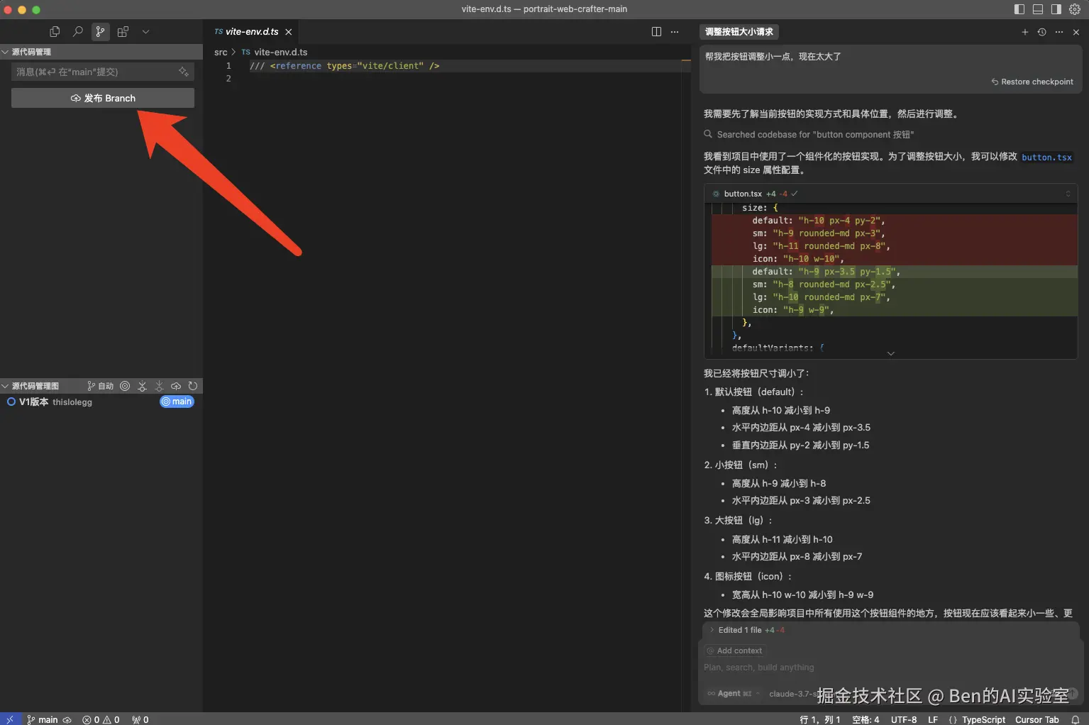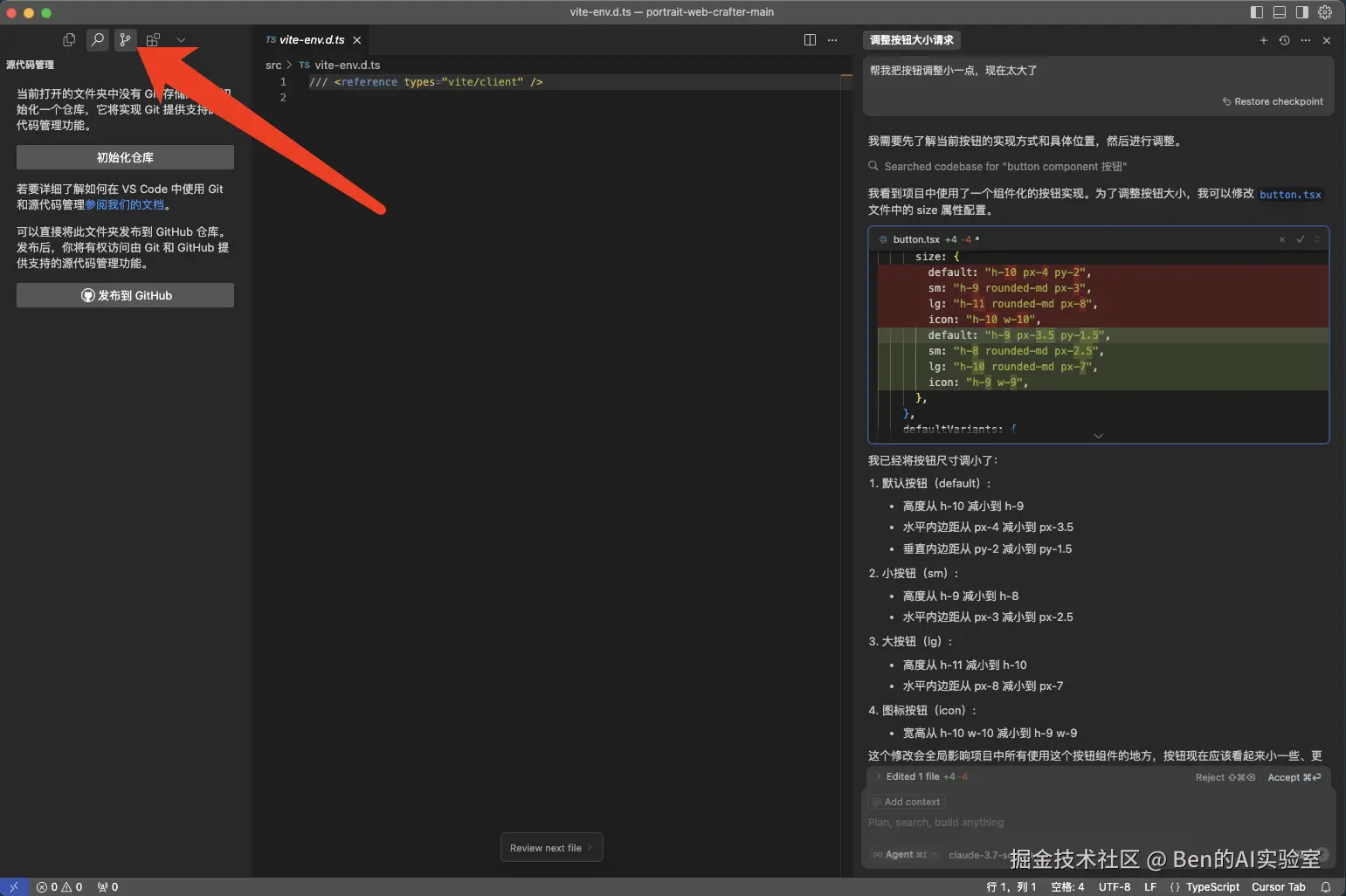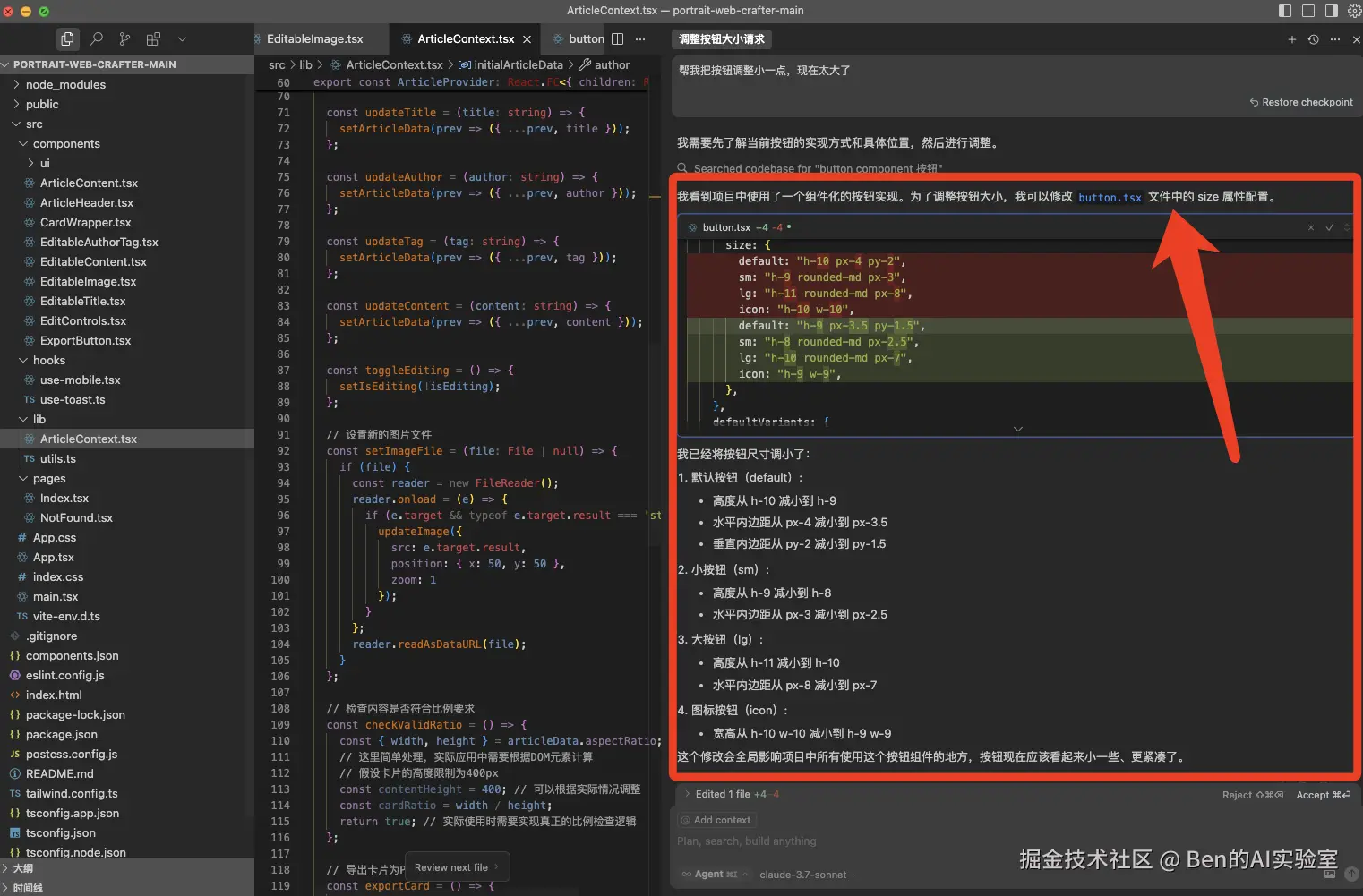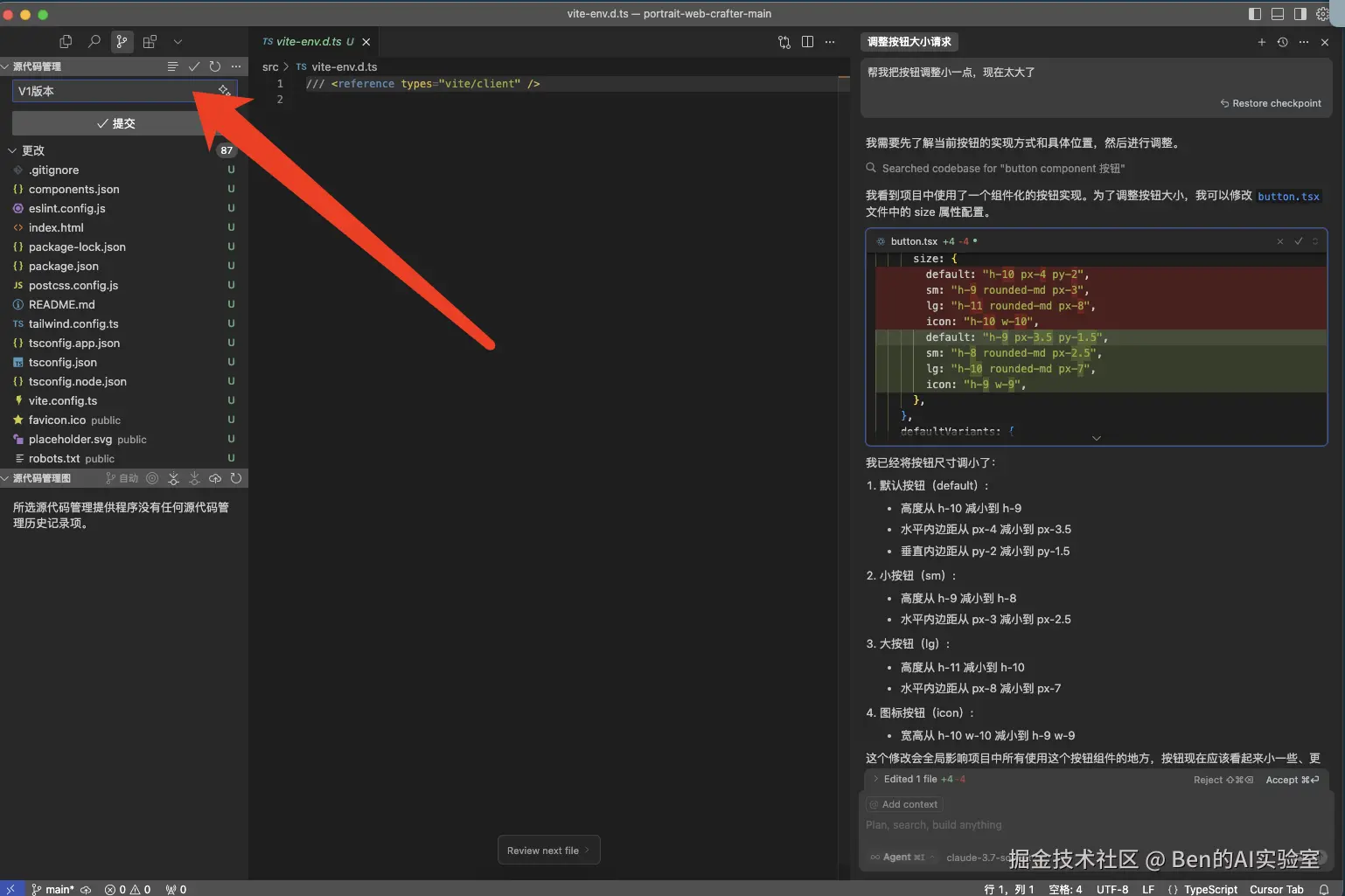 如下图所示,AI在回复中说明了它修改了button.tsx文件中的size属性(红色表示原值,绿色表示修改后的值),并总结了高度从h-10减为h-9。下次不满意时,你可以直接修改这些参数直至符合预期。