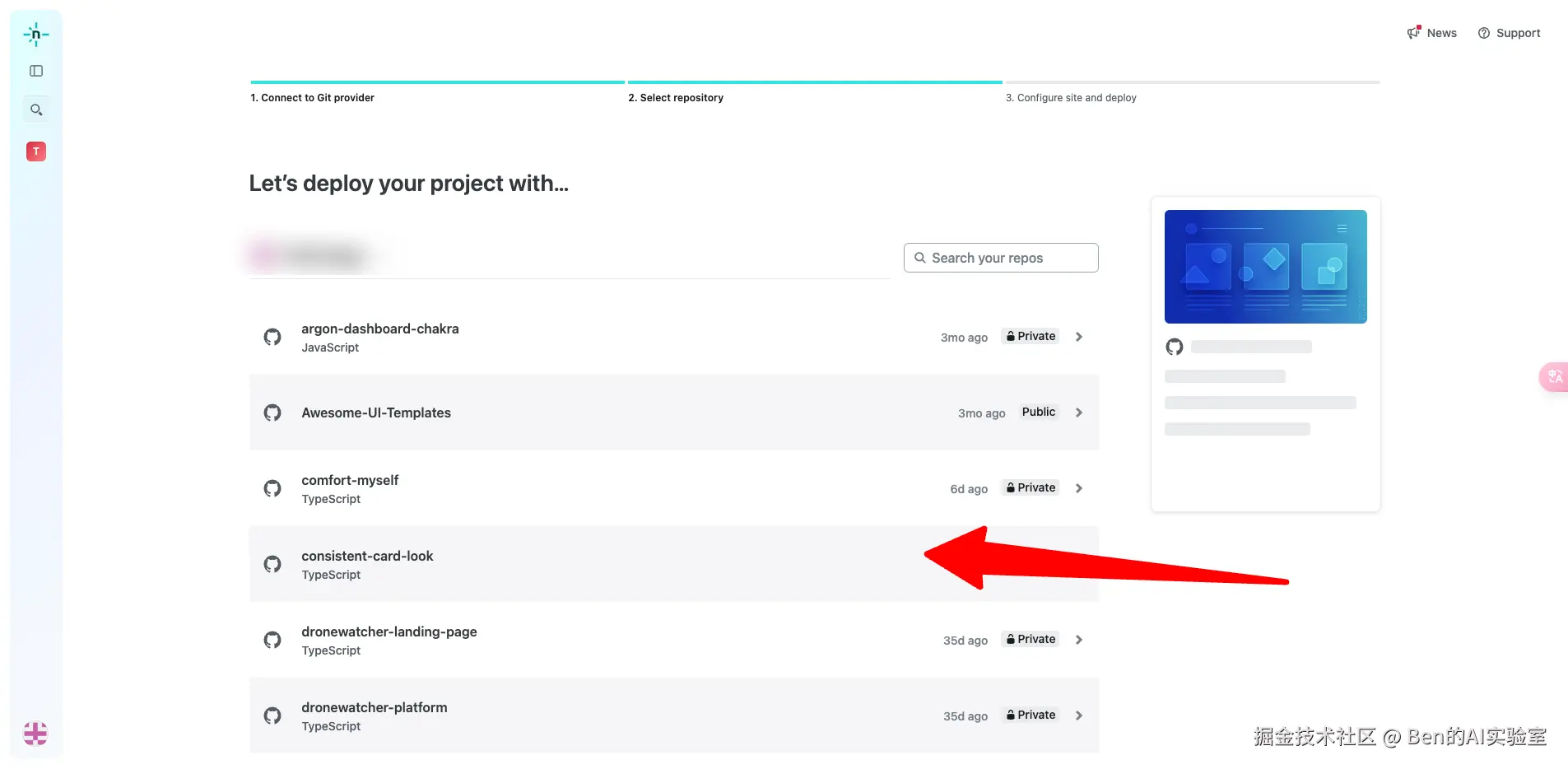 点击【GitHub】完成授权,选择要部署的项目(即刚刚发布到GitHub的项目)。