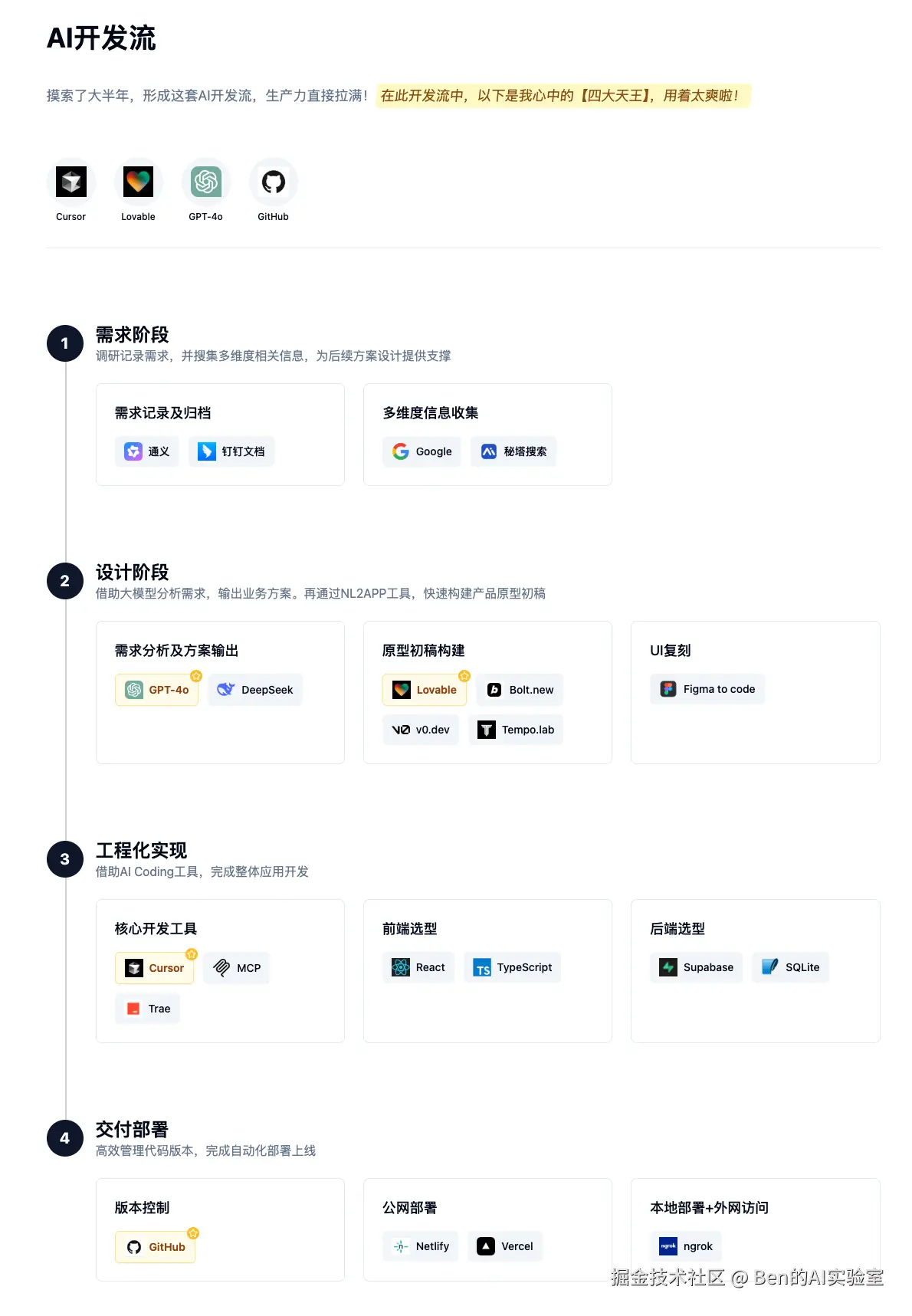 设计阶段:借助GPT4o / DeepSeek梳理需求并产出产品方案,再通过Lovable / v0.dev / Bolt.new / Tempo Labs快速生成产品原型。