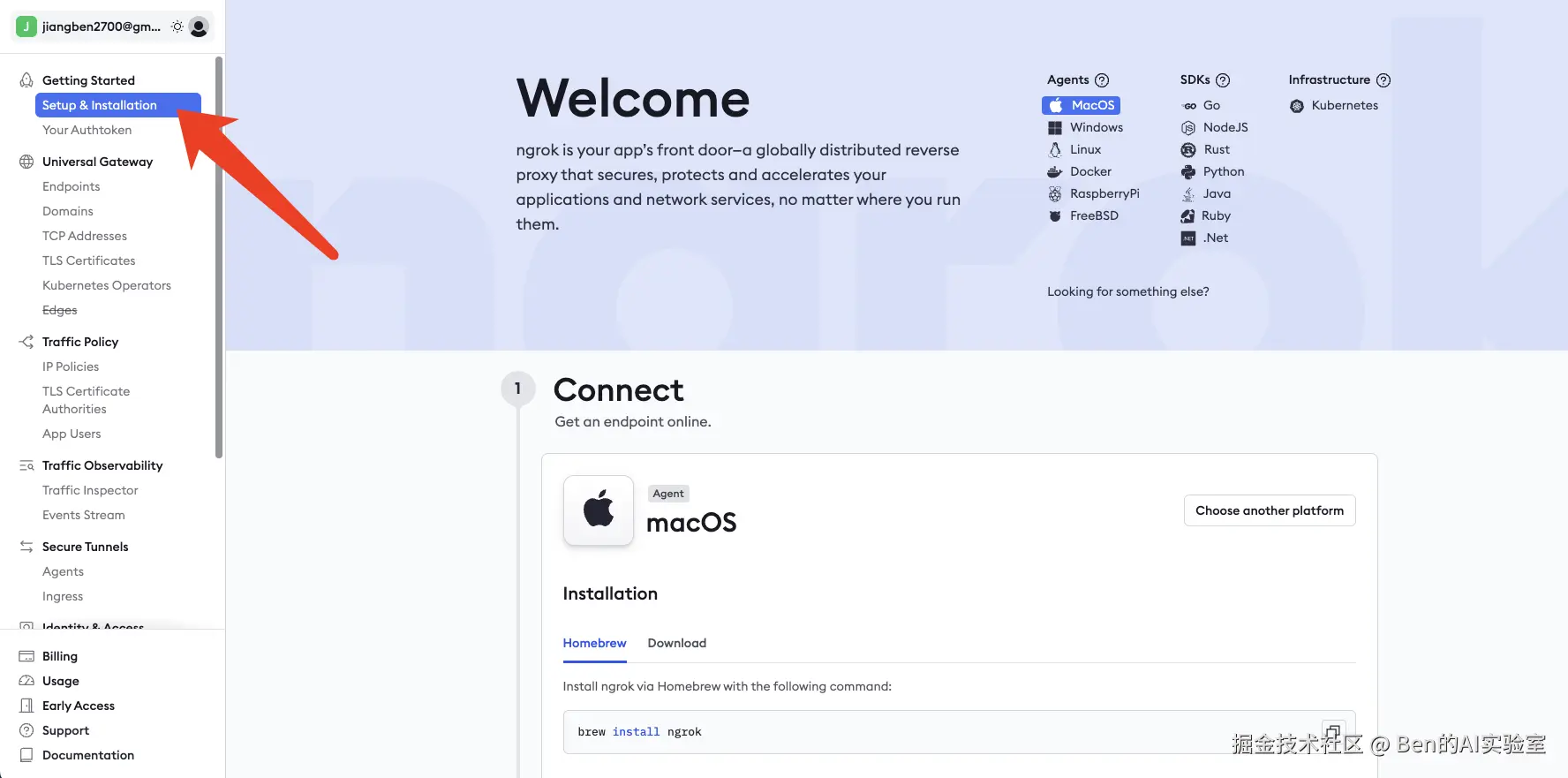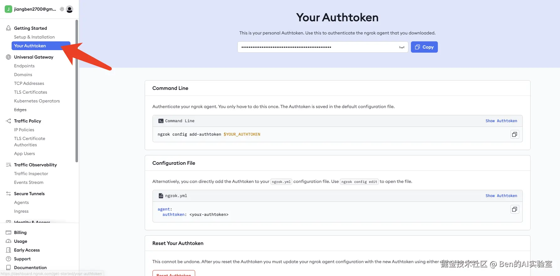 在Dashboard页面,关注左侧导航栏【Getting Started】中的两个页面:安装ngrok工具和获取个人token秘钥。