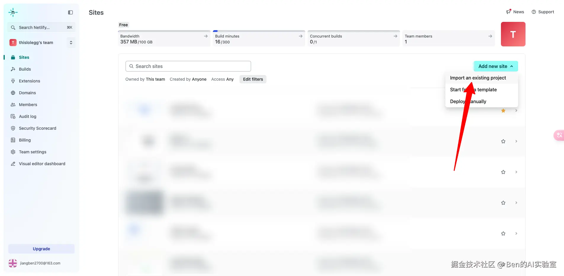登录后,点击左侧【Sites】→右侧【Add new site】→选择【Import an existing project】