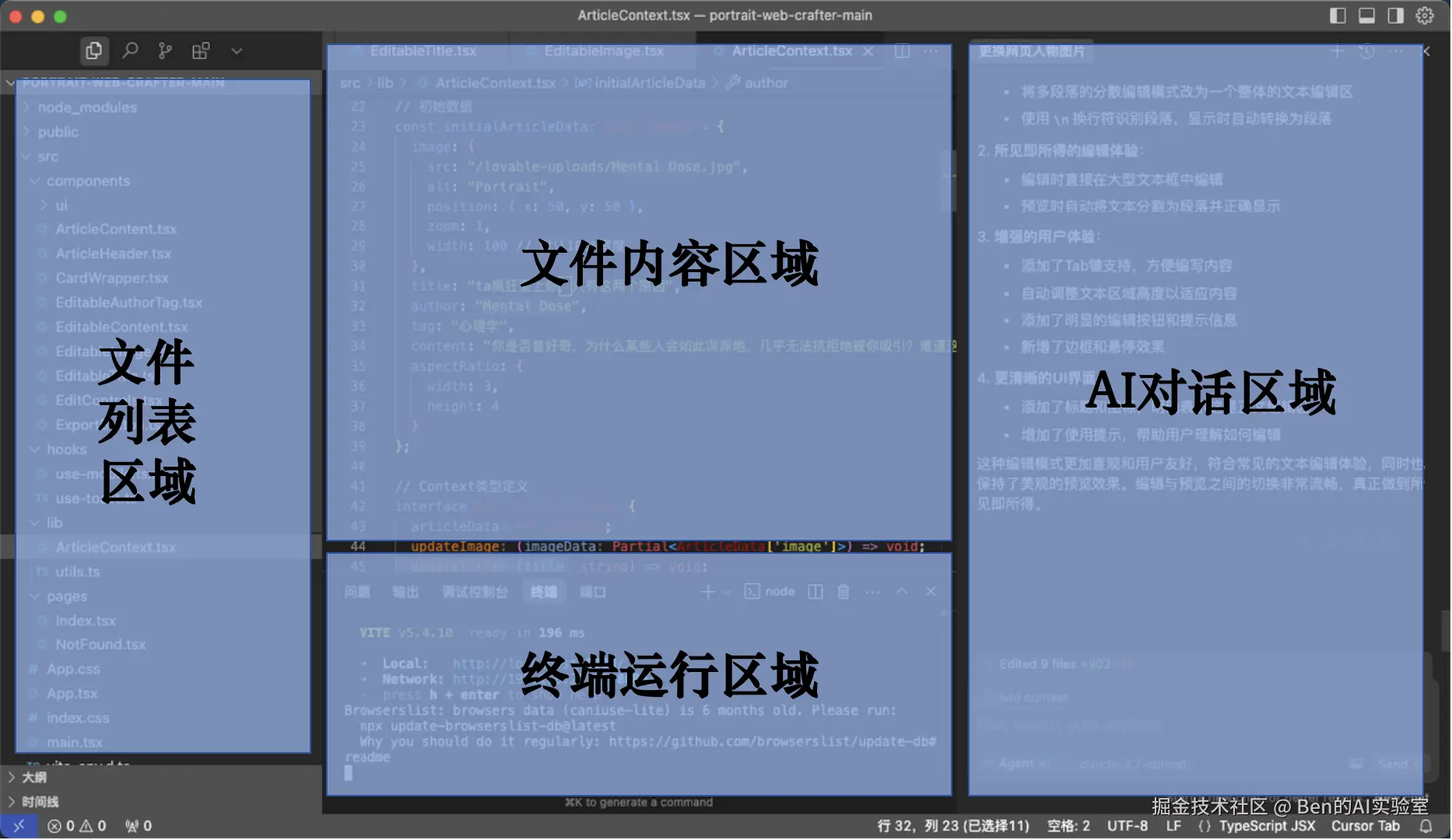 以Cursor为例,界面主要分为四个区域: