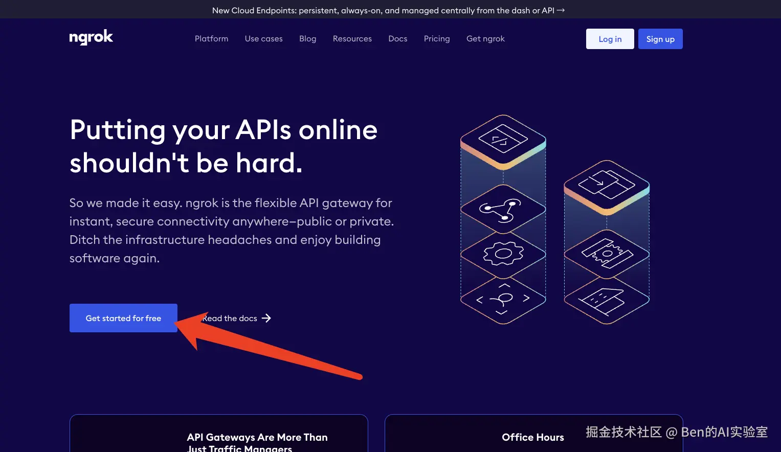 访问ngrok官网,点击"免费开始"按钮,完成注册登录后进入Dashboard页面。