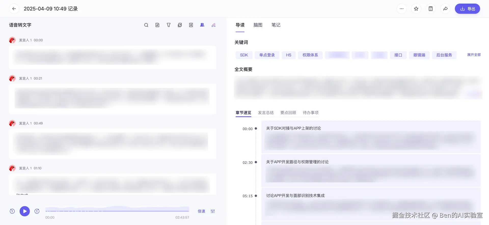 - 利用通义的实时记录完整转录用户需求。会议结束后,查看自动生成的【导读】和【脑图】以充分理解需求,并在【笔记】中记录会议关键点。