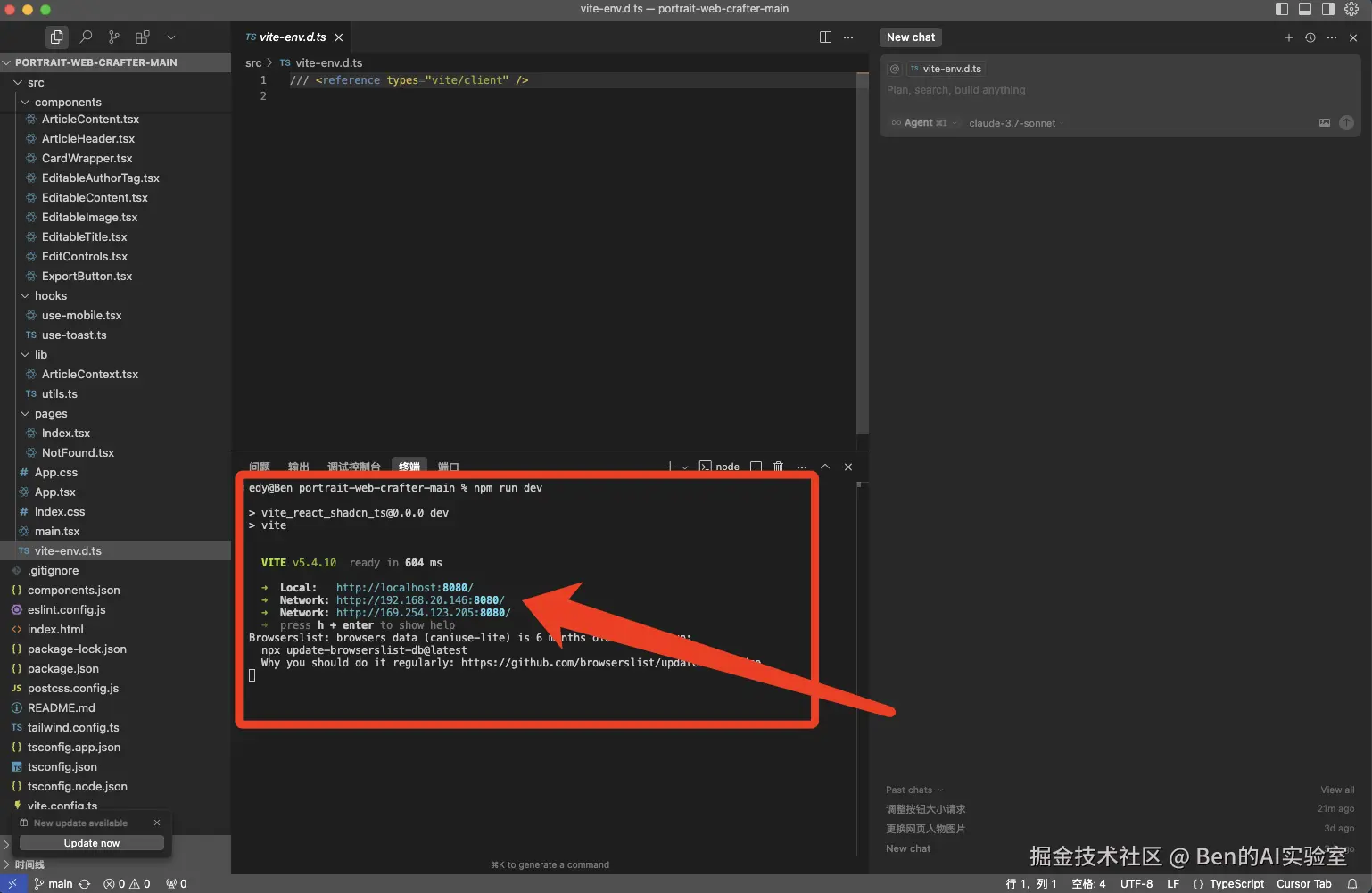 完成必要配置后,在Cursor中运行项目,终端区域会显示项目的局域网地址。新建终端,输入: