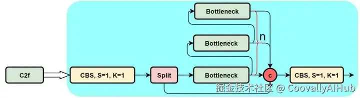C2F块(具有2F连接的跨阶段部分)是一种增强的特征提取块,旨在改善梯度流、特征重用和计算效率。