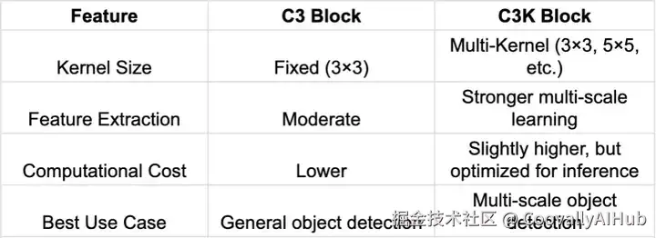 与传统的多尺度方法不同,C3K 平衡了准确性和计算成本。针对边缘设备和嵌入式 AI 系统的实时处理进行了优化。