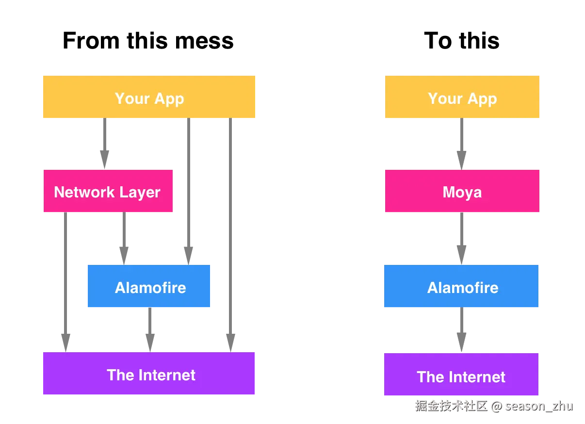 这个是Moya官方给出的示例图,Moya封装了Alamofire的细节之后,App其实就可以直接调用了: